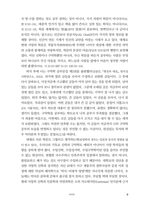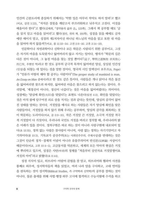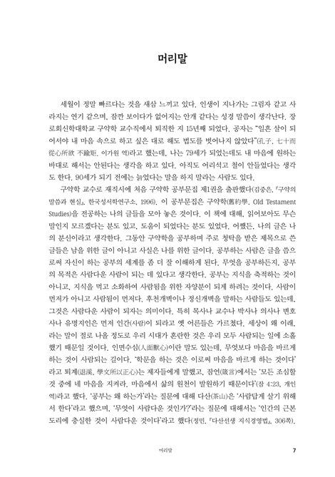 ÀÌ °øºÎ¹®ÁýÀº ±¸¾àÇÐ(ÏÁå³ùÊ, Old Testament Studies)À» Àü°øÇÏ´Â ³ªÀÇ ±ÛµéÀ» ¸ð¾Æ ³õÀº °ÍÀÌ´Ù. ÀÌ Ã¥¿¡ ´ëÇØ, Àо¾Æµµ ¹«½¼ ¸»ÀÎÁö ¸ð¸£°Ú´Ù´Â ºÐµµ ÀÖ°í, µµ¿òÀÌ µÇ¾ú´Ù´Â ºÐµµ ÀÖ¾ú´Ù. ¾î¶µç, ³ªÀÇ ±ÛÀº ³ªÀÇ ºÐ½ÅÀ̶ó°í »ý°¢ÇÑ´Ù. ±×µ¿¾È ±¸¾àÇÐÀ» °øºÎÇϸç ÁַΠûŹÀ» ¹ÞÀº Á¦¸ñÀ¸·Î ¾´ ±ÛµéÀº ³²À» À§ÇÑ ±ÛÀÌ ¾Æ´Ï°í »ç½ÇÀº ³ª¸¦ À§ÇÑ ±ÛÀÌ´Ù. °øºÎÇÏ´Â »ç¶÷Àº ±ÛÀ» ¾¸À¸·Î½á ÀÚ½ÅÀÌ ÇÏ´Â °øºÎÀÇ ¼¼°è¸¦ Á» ´õ Àß ÀÌÇØÇÏ°Ô µÈ´Ù. ¹«¾ùÀ» °øºÎÇϵçÁö, °øºÎÀÇ ¸ñÀûÀº »ç¶÷´Ù¿î »ç¶÷ÀÌ µÇ´Â µ¥ ÀÖ´Ù°í »ý°¢ÇÑ´Ù. °øºÎ´Â Áö½ÄÀ» ÃàÀûÇÏ´Â °ÍÀÌ ¾Æ´Ï°í, Áö½ÄÀ» ¸Ô°í ¼ÒÈÇÏ¿© »ç¶÷µÊÀ» À§ÇÑ ÀÚ¾çºÐÀÌ µÇ°Ô ÇÏ·Á´Â °ÍÀÌ´Ù. ¡®Çй®À» ÇÏ´Â °ÍÀº ÀÌ·Î½á ¸¶À½À» ¹Ù¸£°Ô ÇÏ´Â °ÍÀÌ´Ù¡¯¶ó°í Åð°è(÷ÜÍ¢, ùÊÙþá¶ì¤ïáãý)´Â Á¦Àڵ鿡°Ô ¸»Çß°í, Àá¾ð(í×åë)¿¡¼´Â ¡®¸ðµç Á¶½ÉÇÒ °Í Áß¿¡ ³× ¸¶À½À» ÁöÄѶó. ¸¶À½¿¡¼ »îÀÇ ¿øÃµÀÌ ¹ß¿øÇϱ⠶§¹®ÀÌ´Ù¡¯(Àá 4:23, °³Àοª)¶ó°í Çß´Ù. ¡®°øºÎ´Â ¿ÖÇϴ°¡¡¯¶ó´Â Áú¹®¿¡ ´ëÇØ ´Ù»ê(Òþߣ)Àº ¡®»ç¶÷´ä°Ô »ì±â À§Çؼ ÇÑ´Ù¡¯¶ó°í ÇßÀ¸¸ç, ¡®¹«¾ùÀÌ »ç¶÷´Ù¿î °ÍÀΰ¡?¡¯¶ó´Â Áú¹®¿¡ ´ëÇØ¼´Â ¡®Àΰ£ÀÇ ±Ùº»µµ¸®¿¡ Ãæ½ÇÇÑ °ÍÀÌ »ç¶÷´Ù¿î °ÍÀÌ´Ù¡¯¶ó°í Çß´Ù. Àΰ£ÀÇ ±Ùº»µµ¸®¿¡ Ãæ½ÇÇϱâ À§Çؼ´Â ¡®¾ÇÇÑ ÀÏÀº ¾Æ¹«¸® À۾Ƶµ ÇÏÁö ¸»¶ó¡¯°í Çß°í, ¡°ÀúÁö¸¥ À߸øÀ» ±ú´Ý°í¼ ºÎ²ô·¯¿öÇÏ°í ´µ¿ìÄ¡°í °íÄ£´Ù. À̰ÍÀ» ¹è¿òÀ̶ó ÇÑ´Ù¡±°í Çß´Ù. ±×·¡¼ Ã¥ °øºÎÇÒ ¶§µµ ¡®±ÛÀ» ÀÐÁö ¸»°í ¸¶À½À» Àоî¶ó¡¯°í Çß´Ù. ¼º°æÀ» ÀÐÀ» ¶§¿¡µµ ±ÛÀÚ¿¡¸¸ ¸ÅÀÌÁö ¸»°í, ¼º°æÀÇ Á¦1ÀúÀÚÀ̽ŠÇϳª´Ô ÇÏ´À´ÔÀÇ ¸¶À½À» ÀÐ°í ¶ÇÇÑ ³» ¸¶À½À» Àоî¾ß ÇÏÁö ¾ÊÀ»±î?