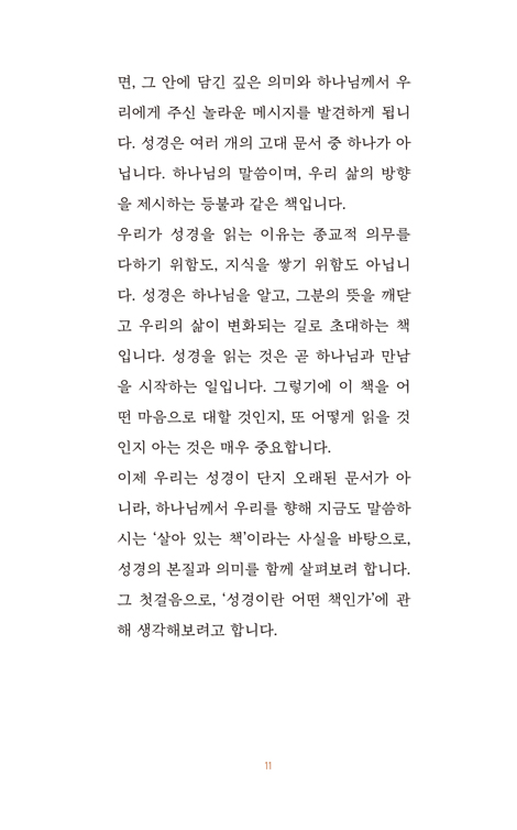 ¼º°æÀº ´Ü¼øÇÑ Á¾±³ ¹®¼°¡ ¾Æ´Õ´Ï´Ù. Çϳª´Ô²²¼ ¿ì¸®¸¦ À§ÇØ Á÷Á¢ ¾²½Å À̾߱âÀ̸ç, Áö±Ýµµ ¿ì¸®¿¡°Ô ¸»¾¸ÇϽô »ì¾Æ Àִ åÀÔ´Ï´Ù. ¼º°æÀÌ ¾î¶»°Ô ±¸¼ºµÇ¾ú´ÂÁö¸¦ ÀÌÇØÇÏ´Â °ÍÀº ´ÜÁö Áö½ÄÀ» ½×±â À§ÇÔÀÌ ¾Æ´Õ´Ï´Ù. ±× ÀÌÇØ´Â ¿ì¸®°¡ ¸»¾¸À» ´õ ±íÀÌ »ç¶ûÇÏ°Ô ¸¸µé°í, ÀڽŠÀÖ°Ô ¼º°æÀ¸·Î µé¾î°¥ ¼ö ÀÖµµ·Ï µ½´Â ÀºÇýÀÇ ÃÊ´ëÀÔ´Ï´Ù. ¼º°æÀº Çϳª´ÔÀÇ ¸¶À½ÀÌ ´ã±ä ÆíÁöÀ̸ç, ±×ºÐ°ú ¸¸³²ÀÌ ½ÃÀ۵Ǵ ÀÚ¸®ÀÔ´Ï´Ù. ÀÌ Ã¥À» ÅëÇØ ´ç½ÅÀÇ »î¿¡µµ Çϳª´ÔÀÇ À̾߱Ⱑ ½ÃÀ۵DZ⸦ ¼Ò¸ÁÇÕ´Ï´Ù.