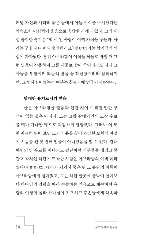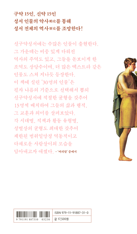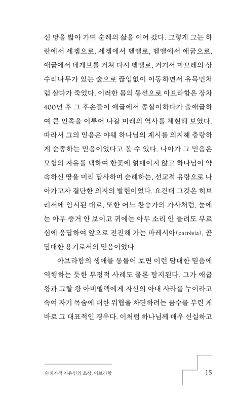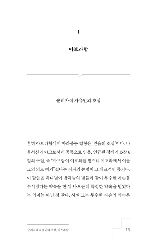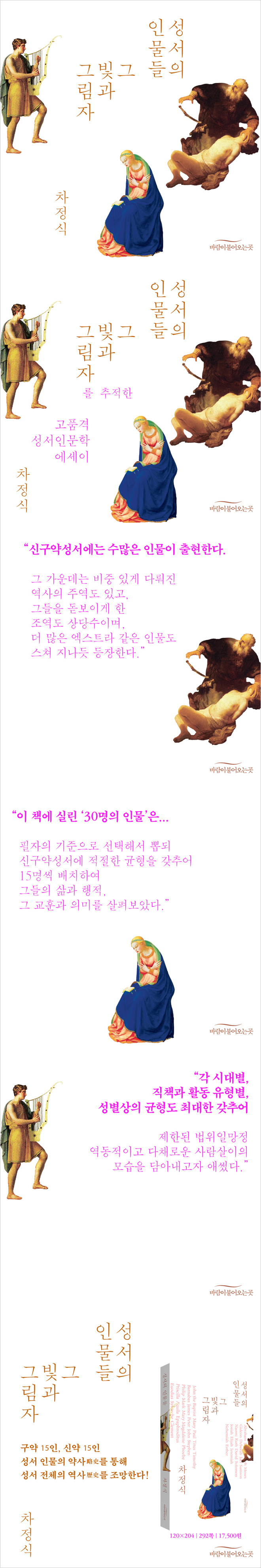½Å±¸¾à¼º¼¿¡´Â ¼ö¸¹Àº Àι°ÀÌ ÃâÇöÇÑ´Ù. ±× °¡¿îµ¥´Â ºñÁß ÀÖ°Ô ´Ù·ïÁø ¿ª»çÀÇ ÁÖ¿ªµµ ÀÖ°í, ±×µéÀ» µ¸º¸ÀÌ°Ô ÇÑ Á¶¿ªµµ »ó´ç¼öÀ̸ç, ´õ ¸¹Àº ¿¢½ºÆ®¶ó °°Àº Àι°µµ ½ºÃÄ Áö³ªµí µîÀåÇÑ´Ù. ÀÌ Ã¥¿¡ ½Ç¸° ¡¯30¸íÀÇ Àι°¡¯Àº ÇÊÀÚ ³ª¸§ÀÇ ±âÁØÀ¸·Î ¼±ÅÃÇØ¼ »ÌµÇ ½Å±¸¾à¼º¼¿¡ ÀûÀýÇÑ ±ÕÇüÀ» °®Ãß¾î 15¸í¾¿ ¹èÄ¡ÇÏ¿© ±×µéÀÇ »î°ú ÇàÀû, ±× ±³Èưú Àǹ̸¦ »ìÆìº¸¾Ò´Ù. °¢ ½Ã´ëº°, Á÷Ã¥°ú Ȱµ¿ À¯Çüº°, ¼ºº°»óÀÇ ±ÕÇüµµ ÃÖ´ëÇÑ °®Ãß¾î Á¦ÇÑµÈ ¹üÀ§ÀϸÁÁ¤ ¿ªµ¿ÀûÀÌ°í ´Ùä·Î¿î »ç¶÷»ìÀÌÀÇ ¸ð½ÀÀ» ´ã¾Æ³»°íÀÚ ¾Ö½è´Ù. (¡®¸Ó¸®¸»¡¯ Áß¿¡¼) P. 15 µû¶ó¼ ±×ÀÇ ¹ÏÀ½Àº ¾ß¿þ Çϳª´ÔÀÇ °è½Ã¸¦ ÀÇÁöÇØ Ãæ·®ÇÏ°Ô ¼øÁ¾ÇÏ´Â ¹ÏÀ½À̾ú´Ù°í º¼ ¼ö ÀÖ´Ù. ³ª¾Æ°¡ ±× ¹ÏÀ½Àº ¸ðÇèÀÇ ÀÚÀ¯¸¦ ÅÃÇÏ¿© ÇѰ÷¿¡ ¾ô¸ÅÀÌÁö ¾Ê°í Çϳª´ÔÀÌ ¾à¼ÓÇϽж¥À» ¹Ì¸® ´ä»çÇÏ¸ç ¼ø·ÊÇÏ´Â, ¼±±³Àû À¯¶ûÀ¸·Î ³ª¾Æ°¡°íÀÚ °á´ÜÇÑ ÀÇÁöÀÇ ¹ßÇöÀ̾ú´Ù. ¿äÄÁ´ë ±×°ÍÀº È÷ºê¸®¼¿¡ ¾Ï½ÃµÈ ´ë·Î, ¶ÇÇÑ ¾î´À Âù¼Û°¡ÀÇ °¡»çó·³, ´«¿¡´Â ¾Æ¹« Áõ°Å ¾È º¸ÀÌ°í ±Í¿¡´Â ¾Æ¹« ¼Ò¸® ¾È µé·Áµµ ºÎ¸£½É¿¡ ÀÀ´äÇÏ¿© ¾ÕÀ¸·Î ÀüÁøÇØ °¡´Â ÆÄ·¹½Ã¾Æ(parrēsia), °ð ´ã´ëÇÑ ¿ë±â·Î¼ÀÇ ¹ÏÀ½À̾ú´Ù. (¡®1. ¼ø·ÊÀÚÀû ÀÚÀ¯ÀÎÀÇ ÃÊ»ó, ¾Æºê¶óÇÔ¡¯ Áß¿¡¼) P. 78 ¸·ÆÇ¿¡ »ï¼ÕÀÌ 3õ ¸íÀÇ Àûµé°ú ÇÔ²² Á×±â·Î ÀÛÁ¤ÇÏ°í ¾ß¿þ Çϳª´Ô²² ºÎ¸£Â¢Àº ±âµµ´Â Áï°¢ ½ÇÇöµÇ¾î ¿ø¼ö¸¦ ´Ü¹ø¿¡ °±±â´Â Çß´Ù. ±×·¯³ª ±× ºñ±ØÀû ÃÖÈİ¡ ¸¶³É ÈÄ·ÃÇÑ °ÍÀº ¾Æ´Ï´Ù. ¿ÀÈ÷·Á ÂòÂòÇÑ µÞ¸ÀÀ» ³²±â´Â °ÍÀº ¹«¾ùº¸´Ù ¹ÎÁ· °øµ¿Ã¼¸¦ À§ÇØ Ã¶ÀúÈ÷ Çå½ÅÇØ ¿Â ¿Ü·Î¿î ¿µ¿õÀ» ǰ¾î ÁÙ µ¿Á·ÀÌ ¾Æ¹«µµ ¾ø¾ú±â ¶§¹®ÀÏ °ÍÀÌ´Ù. ³ª¾Æ°¡ ±× Àΰ£Àû °áÇÌÀ» ä¿ì·Á ¼øÁ¤ÇÏ°Ô »ç¶ûÇϰíÀÚ Çß´ø ÀÌ¹æ ¿©Àο¡°Ô öÀúÇÏ°Ô ¹è½Å´çÇÑ Á¡µµ ±× ÀÌÀ¯ Áß ÀϺÎÀÏ °ÍÀÌ´Ù. ±×·¯³ª ž±âµµ Àü¿¡ ¾ø´Â žƸ¦ ¸¸µé¾î ÁØ ´ë°¡·Î ±×ÀÇ ÀÚ¹ßÀû ÀÇÁö³ª °á´Ü°ú ÀüÇô ¹«°üÇÏ°Ô ±×¸¦ ³ª½ÇÀÎÀ¸·Î »ïÀº ±× ºÎ¸ð¿Í Çϳª´ÔÀº »ï¼ÕÀÇ ºñ±Ø¿¡ ¾Æ¹«·± Ã¥ÀÓÀÌ ¾ø´Â °ÍÀϱî. (¡®7. °íµ¶ÇÑ ¿µ¿õÀÇ ºñ±Ø, »ï¼Õ¡¯ Áß¿¡¼) P. 85 ´õ±¸³ª ±× ½Ã´ëÀû ¹è°æÀÌ »ç¶÷µéÀÌ ¡°°¢°¢ ÀÚ±âÀÇ ¼Ò°ß¿¡ ¿ÇÀº ´ë·Î¡± ÇàÇÏ´ø È¥µ·ÀÇ »ç»ç ½Ã´ë¿´À½À» °¨¾ÈÇÒ ¶§ ³ª¿À¹Ì¿Í ·íÀÇ À̾߱â´Â ¾Æ¹«¸® È¥¶õ½º·¯¿î »óȲ¿¡¼µµ Èñ¸ÁÀÇ ºÒ¾¾°¡ »ì¾Æ³²¾Æ ¸Ô°í »ì¸ç ¦À» Áö¾î ÀÚ½ÄÀ» ³º´Â ÀÏ»ó´Ù¹Ý»ç °¡¿îµ¥ ¸é¸éÈ÷ Àü½ÂµÇ¾î °£´Ù´Â Á¡À» Àϱú¿ö ÁØ´Ù. ÀÌ ¶¥¿¡ ¾Æ±â°¡ žٴ Æò¹üÇϸ鼵µ ºñ¹üÇÑ »ç½ÇÀº Çϳª´ÔÀÌ ÀÌ ¶¥¿¡ ´ëÇÑ Èñ¸ÁÀ» ¾ÆÁÖ Æ÷±âÇÏÁö ¾Ê¾Ò´Ù´Â ¡ǥÀÓÀ» º¸¿© ÁÖµíÀÌ ¸»ÀÌ´Ù. (¡®8. ¼øÁ¤ÇÑ Ãæ½Ç¼ºÀÇ ¿øÇü, ³ª¿À¹Ì¿Í ·í¡¯ Áß¿¡¼) P. 95 ±×´Â õ °³ÀÇ ¾ó±¼À» Áö´Ñ Á¤Ä¡°¡¿´°í ¿ë°¨¹«½ÖÇϰí Áö·«ÀÌ ¶Ù¾î³ ±ºÀÎÀ̾úÁö¸¸ µ¿½Ã¿¡ ¾î·Á¼ºÎÅÍ Àü¿ø ȯ°æ¿¡¼ °¡ÃàÀ» µ¹º¸¸ç ÀÚ¿¬À» ޱ¸Çϱæ Áñ°Å¿öÇÏ°í ¼ö±ÝÀ» Ÿ¸ç ³ë·¡¸¦ ÁöÀº ½ÃÀÎÀ̱⵵ Çß´Ù. ±×¿¡°Ô´Â õºÎÀûÀÎ ½ÃÀÎÀÇ °¨¼ö¼ºÀÌ ±× À¯³â±â¿Í û¼Ò³â±â¸¦ °ÅÄ¡¸é¼ ÀÚ»ýÇß°í, ±×°ÍÀÌ ±×¸¦ ź·ÂÀûÀÎ Àΰ£, âÁ¶ÀûÀÎ Á¸Àç·Î Ű¿ö ³Â´ø °ÍÀÌ´Ù. ±×´Â ±Ç·ÂÀÇ ÀÌÀü°ú ÀÌÈÄ Åº½ÄÇÏ´Â Àΰ£À̾ú°í, ȸ°³ÀÇ ´«¹°·Î ÀÚ½ÅÀÇ ³»¸éÀ» ±íÀÌ ¼ºÂûÇÏ¸é¼ ±× Á¤ÈµÈ ¿µÈ¥ÀÇ °Å¿ïÀ» ÅëÇØ Çϳª´ÔÀ» ¹ß°ßÇÏ°í ¿¹ÂùÇÒ ÁÙ ¾Æ´Â ÃÊ¿ùÀû Àΰ£À¸·Î ¼ºÀåÇØ ³ª°¬´Ù. (¡®9. õ °³ÀÇ ¾ó±¼, ´ÙÀ¡¯ Áß¿¡¼) P. 176 µ¿½Ã¿¡ ±×´Â ²÷ÀÓ¾øÀÌ ´ÞÀ½¹ÚÁúÇÏ¸é¼ ±× º¯°æÀ» °³Ã´ÇØ ³ª°£ ÀüõÈÄ ¼±±³»çÀÌÀÚ ±³È¸ Á¶Á÷°¡¿´°í ±×¸®½ºµµ¸¦ º»¹Þ¾Æ ±× ÀǹÌÀÇ ¹Ý°æÀ» ¸¸À¯¸¦ ÇâÇØ È®ÀåÇØ ³ª°£ ¸í¹ÎÇÑ ½ÅÇÐÀÚ¿´´Ù. ±×·¯³ª ±×ÀÇ ½ÅÇÐÀÚ µÊÀº ¿À´Ã³¯ ½Ç³»¿¡¼ °ü³äÀÇ ÀÚ¸ÆÁú °¡¿îµ¥ Çϳª´ÔÀ» ¹¬»óÇÏ¸ç ±Û·Î ±ò¦°Å¸®´Â À¯ÇüÀÇ Ã¥»ó¹°¸² ½ÅÇÐÀÚ¿Í´Â Â÷¿øÀÌ ´Ù¸£´Ù. ±×´Â °ú¿¬ ±æ À§ÀÇ ½ÅÇÐÀÚ·Î ²÷ÀÓ¾øÀÌ ÇÑ ¸¶À»¿¡¼ ´Ù¸¥ ¸¶À»·Î ±âµ¿ÇÏ¸ç »ç¶÷À» ¸¸³µ°í, ±×µé¿¡°Ô º¹À½À» ÀüÇ쵂 °¢Á¾ À§ÇùÀ» ¹«¸¨¾²°í ±×¸®½ºµµÀÇ Ç©´ë¸¦ ÇâÇØ ´Þ·Á°¡±æ ¸ØÃßÁö ¾Ê¾Ò´Ù. ¿äÄÁ´ë ±×´Â ±×¸®½ºµµÀÇ º¹À½À» À§ÇØ ¿î¸íÀ» °ÉµÇ »ýÀÇ ¸¶Áö¸· È£Èí¸¶Àúµµ ¾Æ³¢Áö ¾Ê°í Åõ¿©ÇÑ Çå½ÅÀûÀÎ º¹À½ ÀüÆÄÀÚ¿´´Ù. (¡®3. ÀüõÈÄ °³Ã´ ¼±±³»ç, ¹Ù¿ï¡¯ Áß¿¡¼) P. 203 ±×´Â »çµµÇàÀüÀÇ Áõ¾ð´ë·Î ¡®À§·ÎÀÇ ¾Æµé¡¯ ¶Ç´Â ¡®°Ý·ÁÀÇ ¾Æµé¡¯(hyios paraklēseos)À̾ú´Ù. 