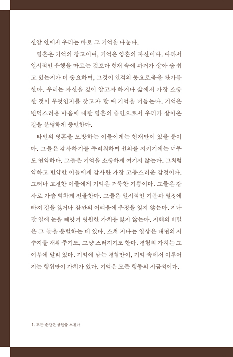 ¿¹¹è¿Í »îÀº ºÐ¸®µÇ¾î ÀÖÁö ¾Ê´Ù. »î ÀÚü°¡ ¿¹¹èÀÇ ÇÑ ÇüŰ¡ µÇÁö ¾Ê´Â ÇÑ ¿ì¸®ÀÇ ¿¹¹è¿¡´Â »ý¸íÀÌ ¾ø´Ù. Á¾±³´Â Ưº°ÇÑ ÃàÀϵéÀ» µû·Î ¶¼¾î ±â³äÇÏ´Â, ±×·± º°µµ·Î ÁöÁ¤µÈ ½Ã°£¿¡ °üÇÑ °ÍÀÌ ¾Æ´Ï´Ù. ¿µÈ¥Àº ±×ó·³ °í°íÇÑ °÷¿¡ °í¸³µÇ¸é ½Ãµé¾î ¹ö¸®°í ¸¸´Ù. ¾î¶² ÀýÁ¤¿¡ ´Ù´Ù¸£´Â Èñ±ÍÇÑ ¼ø°£ ÀÚü¿¡ ÁÖ¸ñÇÒ °ÍÀÌ ¾Æ´Ï¶ó, ±× Èñ±ÍÇÑ ¼ø°£ÀÌ Àüü Àλý¿¡ ¾î¶»°Ô ¿µÇâÀ» ¹ÌÄ¡´Â°¡¸¦ ¹Ù¶óºÁ¾ß ÇÑ´Ù. ±× Á¡ÀÌ °áÁ¤ÀûÀÌ´Ù.