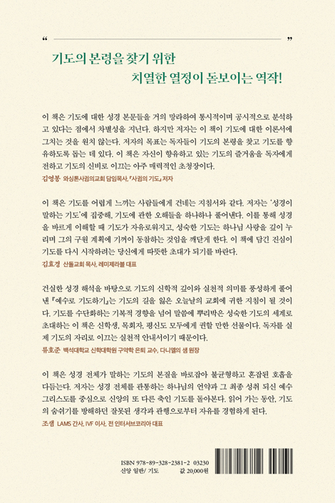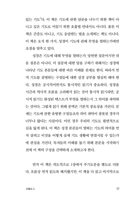 ±âµµÀÇ º»·ÉÀ» ã±â À§ÇÑ ÀúÀÚÀÇ Ä¡¿­ÇÑ ¿­Á¤ÀÌ µ¸º¸ÀÌ´Â ¿ªÀÛÀÌ´Ù. ÀÌ Ã¥Àº ±âµµ¿¡ ´ëÇÑ ¼º°æ º»¹®µéÀ» °ÅÀÇ ¸Á¶óÇÏ¿© Åë½ÃÀûÀÌ¸ç °ø½ÃÀûÀ¸·Î ºÐ¼®Çϰí ÀÖ´Ù´Â Á¡¿¡¼­ Â÷º°¼ºÀ» Áö´Ñ´Ù. ÀúÀÚ´Â ±âµµ¿¡ °üÇÑ ¿©·¯ ÁÖÁ¦¸¦ µû¶ó ¼º°æ º»¹®µéÀ» ºÐ·ùÇϰí, Á¤¹ÐÇÑ ÁÖ¼®À» ÅëÇØ ±× Àǹ̸¦ ¹àÈ÷°í, ±×°ÍÀÌ ±âµµÀÇ ½ÇÁ¦¿¡ ´ëÇØ ¾î¶² Àǹ̰¡ ÀÖ´ÂÁö¸¦ Á¦½ÃÇÑ´Ù. ÇÏÁö¸¸ ÀúÀÚ´Â ÀÌ Ã¥ÀÌ ±âµµ¿¡ ´ëÇÑ À̷м­¿¡ ±×Ä¡´Â °ÍÀ» ¿øÄ¡ ¾Ê´Â´Ù. ÀúÀÚÀÇ ¸ñÇ¥´Â ÀÌ ¸ðµç °úÁ¤À» ÅëÇØ µ¶ÀÚµéÀÌ ±âµµÀÇ º»·ÉÀ» ã°í ±âµµ¸¦ ÇâÀ¯Çϵµ·Ï µ½´Â µ¥ ÀÖ´Ù. ÀÌ Ã¥Àº ÀÚ½ÅÀÌ ÇâÀ¯Çϰí ÀÖ´Â ±âµµÀÇ Áñ°Å¿òÀ» µ¶ÀÚ¿¡°Ô ÀüÇÏ°í ±âµµÀÇ ½Åºñ·Î À̲ô´Â ¾ÆÁÖ ¸Å·ÂÀûÀÎ ÃÊûÀåÀÌ´Ù.