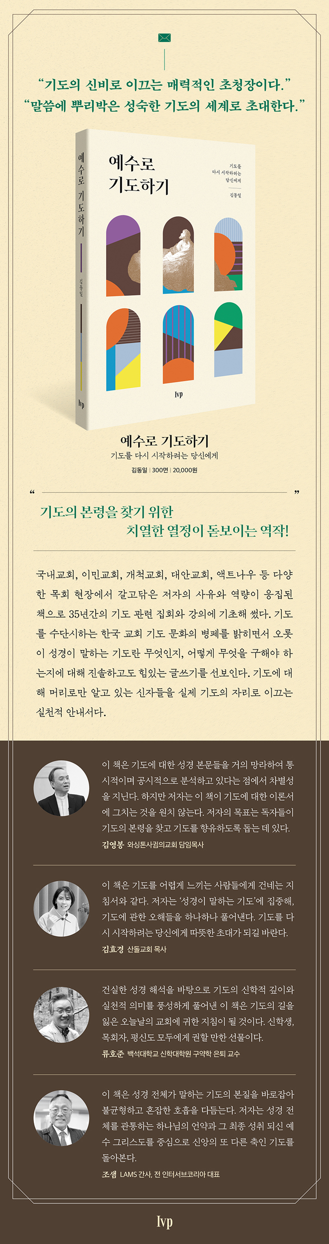 ¼Â°, °¢ ÀåÀº ¸íÈ®ÇÑ ÁÖÁ¦¸¦ Áß½ÉÀ¸·Î Àü°³µÇ¸ç, ¼Ò±×·ìÀ» À§ÇÑ Åä·Ð Áú¹®±îÁö Æ÷ÇԵǾî ÀÖ¾î ½ÇÁ¦ Àû¿ëÀÌ °¡´ÉÇÏ´Ù. °­Àdzª ±³È¸ ³» Á¦ÀÚÈÆ·Ã ±³Àç·Îµµ À¯ÀÍÇÏ´Ù. °Ç½ÇÇÑ ¼º°æ ÇØ¼®À» ¹ÙÅÁÀ¸·Î ±âµµÀÇ ½ÅÇÐÀû ±íÀÌ¿Í ½ÇõÀû Àǹ̸¦ dz¼ºÇÏ°Ô Ç®¾î³½ ±èµ¿ÀÏ ¸ñ»çÀÇ ¡º¿¹¼ö·Î ±âµµÇϱ⡻´Â ±âµµÀÇ ±æÀ» ÀÒÀº ¿À´Ã³¯ÀÇ ±³È¸¿¡ ±ÍÇÑ ÁöħÀÌ µÉ °ÍÀÌ´Ù. ±âµµ¸¦ ¼ö´ÜÈ­ÇÏ´Â ±âº¹Àû °æÇâÀ» ³Ñ¾î ¸»¾¸¿¡ »Ñ¸®¹ÚÀº ¼º¼÷ÇÑ ±âµµÀÇ ¼¼°è·Î ÃÊ´ëÇÏ´Â ÀÌ Ã¥Àº ½ÅÇлý, ¸ñȸÀÚ, Æò½Åµµ ¸ðµÎ¿¡°Ô ±ÇÇÒ ¸¸ÇÑ ¼±¹°ÀÌ´Ù. ´Ü¼øÇÑ À̷м­°¡ ¾Æ´Ï¶ó, µ¶ÀÚ¸¦ ½ÇÁ¦ ±âµµÀÇ ÀÚ¸®·Î À̲ô´Â ½ÇõÀû ¾È³»¼­À̱⠶§¹®ÀÌ´Ù.