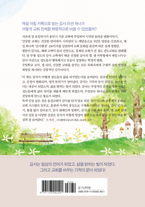 ¡°°¨»ç´Â »îÀ» ³î¶ø°Ô º¯È½ÃŰ´Â ÈûÀÌ ÀÖ´Ù. ³ªÀÌ¿Í »ó°ü¾øÀÌ ¹Ýµå½Ã ¹è¿ö¾ß ÇÑ´Ù. ½ÇõÀÌ ÇÊ¿äÇÑ »îÀÇ ±â¼úÀÌ´Ù. ¹«¼èµµ °¥¸é ¹Ù´ÃÀÌ µÈ´Ù. ¿Áµµ °¥¾Æ¾ß ºûÀÌ ³´Ù. °¨»çµµ ¿¬½ÀÀÌ ÇÊ¿äÇÏ´Ù. ²ÙÁØÇÑ ¿¬½ÀÀº ³î¶ó¿î ÇýÅÃÀ» ÁØ´Ù. ±×·¡¼ ¡®°¨»ç´Â ¹è¿ö¾ß ÇÒ ½À°üÀÌ´Ù. ¿¬½ÀÇØ¾ß ÇÒ ±â¼úÀÌ´Ù¡¯¶ó°í ¸»ÇÑ´Ù. ¿ì¸® ±³È¸ Á¤¹ÌÁ¤ Áý»ç´Â °¨»çÀÇ ÈûÀ» ÀÌ·¸°Ô °£ÁõÇÑ´Ù. ¡®¸ÅÀÏ °¨»ç Àϱ⸦ ¾²¸ç ÇϷ縦 µ¹¾Æº¸°í, ÀßÇÑ ÀÏ¿£ ¿ôÀ½À», ¾Æ½¬¿ò¿¡´Â ¹Ý¼ºÀ» ÇÑ´Ù. ¼¿¿øµé°ú ¼ÒÅëÇϸç Ä«Åå¿¡ ´ä±ÛÀ» ³²±æ Á¤µµ·Î º¯ÈÇß°í, Ä£Á¤¾ö¸¶¿¡°Ô »ç¶ûÇÑ´Ù°í Ç¥ÇöÇÏ´Â ¸ð½Àµµ »ý°å´Ù. °¨»ç¸¦ ÅëÇØ ÀÚ½ÅÀ» µå·¯³»°í ¸ðµç »óȲ¿¡¼ °¨»çÇÒ ¼ö ÀÖ´Â ¹ýÀ» ¹è¿ü´Ù. °¨»ç´Â ½Ã¼±À» ¹Ù²Ù°í »îÀ» dz¿ä·Ó°Ô ÇÑ´Ù, ÀÛÀº °Í¿¡µµ °¨»çÇÏ´Â ½À°üÀÌ ¿ì¸®¸¦ ¼ºÀå½ÃŲ´Ù°í ¸»ÇÑ´Ù. °¨»ç Àϱâ´Â ´Ü¼øÇÑ ±â·ÏÀÌ ¾Æ´Ï¶ó ¼¼»óÀ» »õ·Î¿î ½Ã°¢À¸·Î º¸´Â ¹æ¹ýÀÌ´Ù. ¿À´Ãµµ °¨»çÀÇ ´«À¸·Î ¼¼»óÀ» º¸ÀÚ°í ±ÇÇÑ´Ù.¡¯¡±