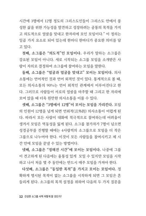 ¼Â°, ¼Ò±×·ìÀº ¡°3¸í¿¡¼ 12¸í¡±ÀÌ ¸ðÀÌ´Â ¸ðÀÓÀ» °¡¸®Å²´Ù. ¸ðÀÓÀÇ ÀοøÀÌ 12¸íÀ» ³Ñ°Ô µÇ¸é ¾ð¿ÜÀû(åëèâîÜ) ÀÇ»ç¼ÒÅëÀÌ ¾î·Æ°Ô µÈ´Ù. µû¶ó¼ ¸ðµç »ç¶÷ÀÌ ´ëÈ¿¡ Àû±ØÀûÀ¸·Î Âü¿©Çϴµ¥ ¾î·Á¿òÀÌ »ý°Ü¼ ¸ðÀÓÀº ¿ªµ¿¼ºÀ» ÀÒ°Ô µÈ´Ù. ¼Ò±×·ì Âü°¡ÀÚ°¡ 7¸íÀÌ ³ÑÀ¸¸é ¼º°æ°øºÎ¸¦ ÁøÇàÇÒ ¶§¿¡´Â 4»ç¶÷¾¿ÀÇ ¼Ò±×·ìÀ¸·Î ¸ðÀÓÀ» ´õ ÀÛÀº ±×·ìÀ¸·Î ³ª´©¾î¾ß ÇÑ´Ù. À̰ÍÀÌ ¸ðµç »ç¶÷µéÀ» Âü¿©½Ã۰í Á¦ ½Ã°£ ¾È¿¡ ¸ðÀÓÀ» ³¡³¾ ¼ö ÀÖ´Â ¹æ¹ýÀÌ´Ù.