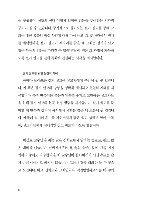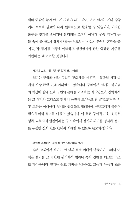 ÀϹÝÀûÀ¸·Î Çѱ¹ ±³È¸´Â ±³È¸·Â¿¡ µû¸¥ Àý±â¸¦ °í¼öÇÏ´Â °æÇâÀÌ ÀÖ°í, ¾ö¹ÐÇÑ °³Çõ±³È¸´Â ¾î¶² Àý±âµµ ÁöÄѼ´Â ¾È µÈ´Ù´Â ÀÔÀåÀ» ÃëÇÕ´Ï´Ù. ÀÌ Ã¥Àº Àý±â°¡ Çϳª´Ô²²¼ Á¤ÇϽЏ¸³²ÀÇ ½Ã°£ÀÌÀÚ ±¸¿øÀÇ ÀºÇý¸¦ µÇ»õ±â´Â °Å·èÇÑ Åë·ÎÀÓÀ» »ó±â½ÃÄÑ ÁÝ´Ï´Ù. Àý±â¸¦ ÆóÁöÇÏ´À³Ä À¯ÁöÇÏ´À³Ä ÇÏ´Â À̺йýÀ» ³Ñ¾î, ½Å¾ÓÀÇ ±â¾ïÀ» ¼¼´ë °£¿¡ ÀÕ°í °øµ¿Ã¼ÀÇ ¹ÏÀ½À» ¼º¼÷ÇÏ°Ô ºú¾î °¡´Â µµ±¸·Î Ȱ¿ëÇÒ ¼ö ÀÖ´Â °¡´É¼ºÀ» º¸¿© ÁÝ´Ï´Ù. ƯÈ÷ Àý±â¸¦ µû¶ó ¼³±³¸¦ °èȹÇÏ°í ¸ñȸ ÀÏÁ¤°ú ¿¹ÀüÀ» dz¼ºÇÏ°Ô ¼¼¿ï ¼ö ÀÖ´Â ½ÇõÀû ÅëÂûÀº °´Ü°ú ±³È¸ ÇöÀå¿¡ Å« µµ¿òÀÌ µÉ °ÍÀÔ´Ï´Ù. ÀÏ»ó°ú ¿¹¹è¸¦ Çϳª´ÔÀÇ ±¸¼Ó °æ·û¿¡ ¸Â°Ô Àç¹è¿Çϵµ·Ï ÃÊ´ëÇÏ´Â ÀÌ Ã¥Àº ÀÏ¹Ý ¼ºµµ´Â ¹°·Ð ¸ñȸÀÚ¿¡°Ôµµ ±ÍÇÑ ¾È³»¼°¡ µÇ¸®¶ó È®½ÅÇÕ´Ï´Ù.