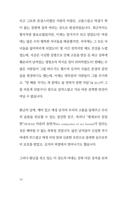 ³ªÀÇ ¼ÒÁßÇÑ ÀþÀº Ä£±¸µéÀÌ¿©, ¿©·¯ºÐµéÀÌ ¿©·¯ºÐµéÀ» µÑ·¯½Î°í °ø°ÝÇÏ´Â ±× ´õ·¯¿òµéÀ» ÇÇÇÒ ¼ö ÀÖ±â(º¦ÈÄ2:20)¸¦ ¹Ù¶ø´Ï´Ù. ±×¸®°í ¿©·¯ºÐµéÀÌ ¿©·¯ºÐµéÀÇ ºÎ¸ð´ÔÀÇ À§·Î¿Í ±³È¸ÀÇ ÀÚ¶û, ±×¸®°í »çȸ¿¡ À¯ÀÍÀ» ³¢Ä¡´Â ÀÚµéÀÌ µÉ ¼ö Àֱ⸦ ¹Ù¶ø´Ï´Ù. ¶ÇÇÑ, ¿©·¯ºÐµéÀÌ ¡°±× ¿À¸¥¼Õ¿¡´Â Àå¼ö°¡, ±× ¿Þ¼Õ¿¡´Â ºÎ±Í°¡ ÀÖ´Â(Àá¾ð3:16)¡± ÇÏ´ÃÀÇ ÁöÇý·Î ¿µ°¨À» ¾ò±â¸¦ ¹Ù¶ø´Ï´Ù. ¶ÇÇÑ, ¸¶Áö¸·À¸·Î ¿©·¯ºÐÀÌ ±¸¼ÓÀÚ(the Redeemer)ÀÇ ´É·Â°ú ÀºÇý¸¦ ÅëÇØ¼ ±×ºÐ°ú ´õºÒ¾î ¿µ¿øÅä·Ï »ì¸ç, ¼¼»óÀ» ´Ù½º¸±¸¸ÇÑ Áغñ¸¦ °®Ãß°Ô µÇ±â¸¦ ¹Ù¶ø´Ï´Ù. À̰ÍÀÌ ¿©·¯ºÐÀ» ¾ÖÁ¤À¸·Î ´ëÇϰíÀÚ ÇÏ´Â ¸ñ»çÀÎ ³»°¡ Áø½ÉÀ¸·Î ¼Ò¸ÁÇÏ´Â ¹ÙÀÌÀÚ ²÷ÀÓ¾øÀÌ ±âµµÇÏ´Â ³»¿ëÀÔ´Ï´Ù.