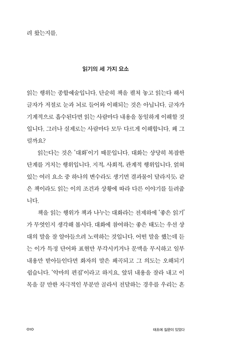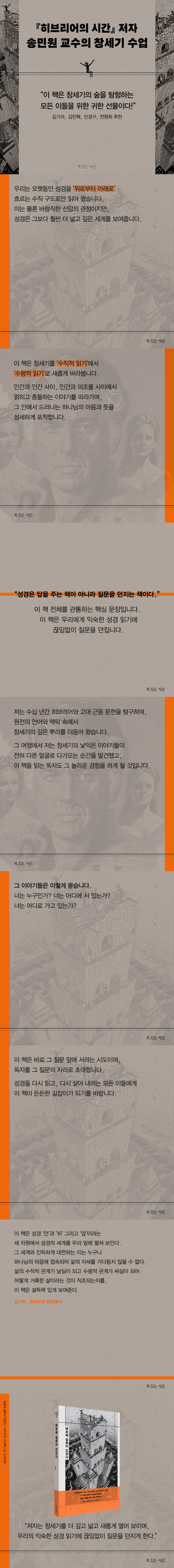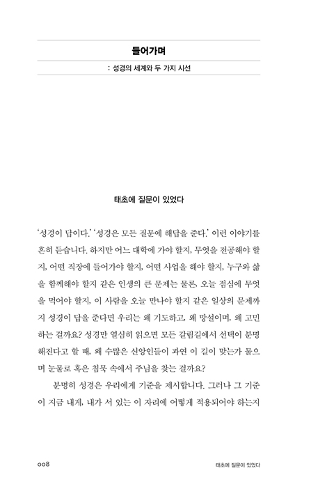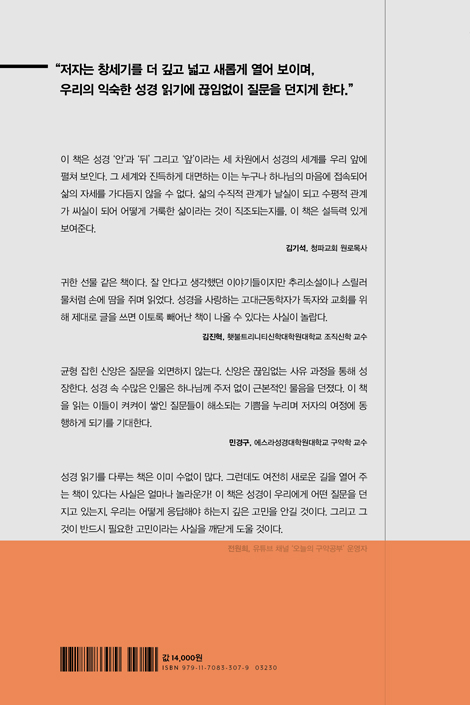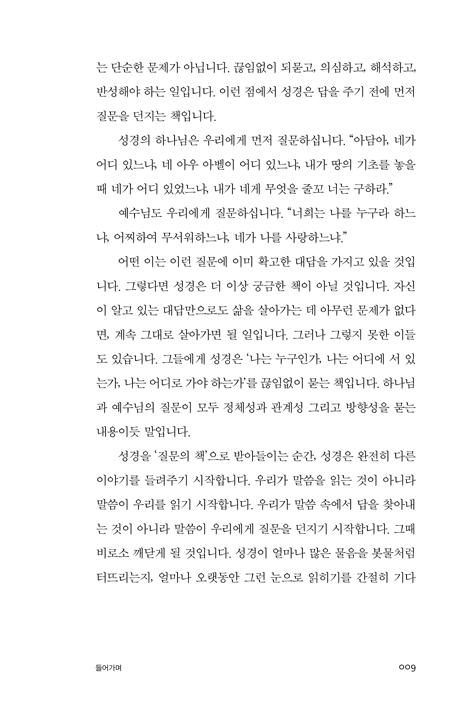 ¡°¼º°æÀº ´äÀ» Áִ åÀÌ ¾Æ´Ï¶ó Áú¹®À» ´øÁö´Â Ã¥ÀÌ´Ù.¡± ÀÌ Ã¥ Àüü¸¦ °üÅëÇÏ´Â ÇÙ½É ¹®ÀåÀÔ´Ï´Ù. ÀÌ Ã¥Àº ¿ì¸®¿¡°Ô Àͼ÷ÇÑ ¼º°æ Àб⿡ ²÷ÀÓ¾øÀÌ Áú¹®À» ´øÁý´Ï´Ù. Àú´Â ¼ö½Ê ³â°£ È÷ºê¸®¾î¿Í °í´ë ±Ùµ¿ ¹®ÇåÀ» ޱ¸ÇÏ¸ç ¿øÀüÀÇ ¾ð¾î¿Í ¸Æ¶ô ¼Ó¿¡¼ â¼¼±âÀÇ ±íÀº »Ñ¸®¸¦ ´õµë¾î ¿Ô½À´Ï´Ù. ±× ¿©Á¤¿¡¼ Àú´Â â¼¼±âÀÇ ³¸ÀÍÀº À̾߱âµéÀÌ ÀüÇô ´Ù¸¥ ¾ó±¼·Î ´Ù°¡¿À´Â ¼ø°£À» ¹ß°ßÇß°í, ÀÌ Ã¥À» Àд µ¶ÀÚµµ ±× ³î¶ó¿î °æÇèÀ» ÇÏ°Ô µÉ °ÍÀÔ´Ï´Ù.