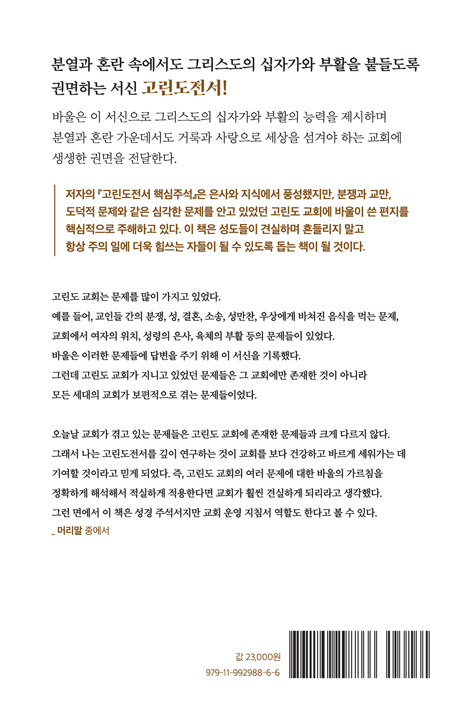 ÀúÀÚÀÇ ¡¸°í¸°µµÀü¼ ÇÙ½ÉÁÖ¼®¡¹Àº Àº»ç¿Í Áö½Ä¿¡¼ dz¼ºÇßÁö¸¸, ºÐÀï°ú ±³¸¸, µµ´öÀû ¹®Á¦¿Í °°Àº ½É°¢ÇÑ ¹®Á¦¸¦ ¾È°í ÀÖ¾ú´Ù. °í¸°µµ ±³È¸¿¡ ¹Ù¿ïÀÌ ¾´ ÆíÁö¸¦ ÇÙ½ÉÀûÀ¸·Î ÁÖÇØÇϰí ÀÖ´Ù. ÀÌ Ã¥Àº ¼ºµµµéÀÌ °ß½ÇÇϸç Èçµé¸®Áö ¸»°í Ç×»ó ÁÖÀÇ ÀÏ¿¡ Èû¾²´Â ÀÚµéÀÌ µÉ ¼ö ÀÖµµ·Ï µ½´Â Ã¥ÀÌ µÉ °ÍÀÌ´Ù.