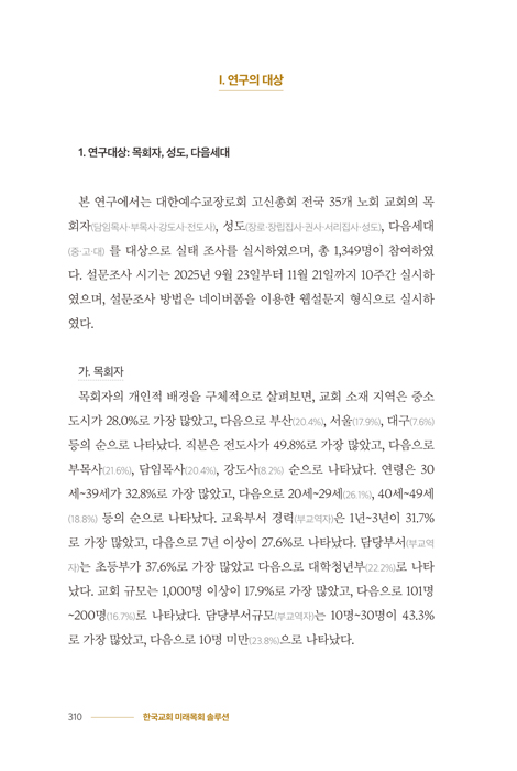 ¸ñȸ ÇöÀåÀº ÀüÀïÅÍ¿Í °°½À´Ï´Ù. ±³È¸´Â ÀüÀïÅÍ °°Àº ¼¼»ó¿¡¼ »ì¾Æ°¡´Â ¼ºµµ°¡ ¸ð¿© ÀÖ´Â °÷À̱⿡ ´õ¿í ±×·¯ÇÕ´Ï´Ù. ¸ñȸÀÚ ÇÑ »ç¶÷ÀÌ ¹«³ÊÁö¸é ±³È¸ Àüü°¡ ¹«³ÊÁý´Ï´Ù. ±×·¯¹Ç·Î ¸ñȸÀÚ´Â »ç°í¸¦ ¸·±â À§ÇØ Æò¼Ò Àڱ⠰ü¸®¸¦ ÇØ¾ß Çϸç, ÀÚ½ÅÀÇ ¿µÈ¥À» ²÷ÀÓ¾øÀÌ µ¹º¸¾Æ¾ß ÇÕ´Ï´Ù. °èÁÖ °æ±â´Â ³ªµµ ÃÖ¼±À» ´ÙÇØ ¶Û »Ó ¾Æ´Ï¶ó ³» ´ÙÀ½ ÁÖÀÚ°¡ ÃÖ¼±À» ´ÙÇØ ¶Û ¼ö ÀÖµµ·Ï µµ¿Í¾ß¸¸ ¿ì½ÂÇÒ ¼ö ÀÖ½À´Ï´Ù. ±³È¸´Â °èÁÖ °øµ¿Ã¼ÀÔ´Ï´Ù. ½Å¾ÓÀÇ ¹ÙÅëÀÌ ´ÙÀ½¼¼´ë·Î Àü´ÞµÇÁö ¸øÇÏ°Ô °¡·Î¸·°í ÀÖ´Â Àå¾Ö¹°À» °È¾î³»°í, ¼¼´ë¸¦ ÅëÇÕÇÏ´Â ¸ñȸ·Î ³ª¾Æ°¡¾ß ÇÕ´Ï´Ù. Çѱ¹±³È¸ ´ÙÀ½¼¼´ë ±³À°ÀÇ ÇÙ½É °úÁ¦´Â ½Å¾Ó Çü¼ºÀÌ ¿©ÀüÈ÷ ´ÜÆíÈµÈ ±¸Á¶ ¼Ó¿¡¼ ÁøÇàµÇ°í ÀÖ´Ù´Â ±¸Á¶Àû ÇѰ踦 ±Øº¹ÇÏ´Â µ¥ ÀÖ½À´Ï´Ù. ¿¹¹è, ±³À°, ºÀ»ç°¡ µû·Î ³ë´Â ºÐÀýµÈ ±¸Á¶¸¦ ŸÆÄÇϰí, »îÀÇ Àü ¿µ¿ª¿¡¼ ½Å¾ÓÀÌ ÅëÇÕÀûÀ¸·Î ¿¬°áµÇ´Â ±³À° °úÁ¤À» ¼³°èÇØ¾ß ÇÕ´Ï´Ù. ÄÚÀ̳ë´Ï¾Æ(±³Á¦)´Â Àüµµ¸¦ À§ÇÑ ¼ö´ÜÀ̳ª À±È°À¯°¡ ¾Æ´Ï¶ó, »ïÀ§ÀÏü Çϳª´ÔÀÌ ´©¸®½Ã´Â »ç¶û¿¡ Âü¿©ÇÏ´Â ½Å¾ÓÀÇ ±Ã±ØÀûÀÎ ¸ñÇ¥ÀÌÀÚ º»ÁúÀÔ´Ï´Ù. ±³È¸°¡ ¼·Î »ç¶ûÇÏ°í µ¹º¸´Â ¸ð½ÀÀ» º¸¿©ÁÖ´Â °ÍÀ̾߸»·Î ¼¼»óÀÌ º¹À½À» ÀÌÇØÇÏ°Ô ¸¸µå´Â °¡Àå °·ÂÇÑ ¼±±³ Àü·«ÀÔ´Ï´Ù. °ü·Ã À̹ÌÁö