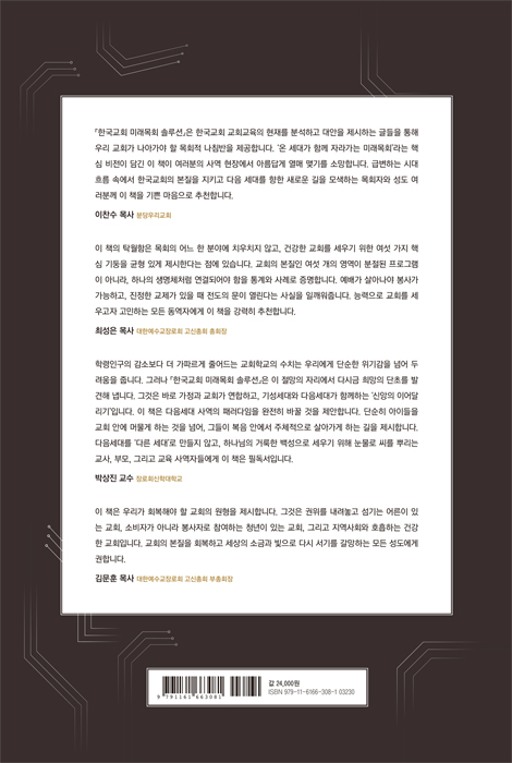 ¡®¿Â ¼¼´ë°¡ ÇÔ²² ÀÚ¶ó°¡´Â ¹Ì·¡¸ñȸ¡¯¶ó´Â ÇÙ½É ºñÀüÀÌ ´ã±ä ÀÌ Ã¥ÀÌ ¿©·¯ºÐÀÇ »ç¿ª ÇöÀå¿¡¼ ¾Æ¸§´ä°Ô ¿¸Å ¸Î±â¸¦ ¼Ò¸ÁÇÕ´Ï´Ù. ±Þº¯ÇÏ´Â ½Ã´ëÀÇ È帧 ¼Ó¿¡¼ Çѱ¹±³È¸ÀÇ º»ÁúÀ» ÁöŰ°í ´ÙÀ½¼¼´ë¸¦ ÇâÇÑ »õ·Î¿î ±æÀ» ¸ð»öÇÏ´Â ¸ñȸÀÚ¿Í ¼ºµµ ¿©·¯ºÐ²² ÀÌ Ã¥ À» ±â»Û ¸¶À½À¸·Î ÃßõÇÕ´Ï´Ù. _ÀÌÂù¼ö ¸ñ»ç(ºÐ´ç¿ì¸®±³È¸) ÀÌ Ã¥Àº ±³È¸ÀÇ °¢ ¿µ¿ªÀÌ ºÐÀýµÈ ÇÁ·Î±×·¥ÀÌ ¾Æ´Ï¶ó, ÇϳªÀÇ »ý¸íüó·³ ¿¬°áµÇ¾î¾ß ÇÔÀ» Åë°è¿Í »ç·Ê·Î Áõ¸íÇÕ´Ï´Ù. ¿¹¹è°¡ »ì¾Æ³ª¾ß ºÀ»ç°¡ °¡´ÉÇϰí, ÁøÁ¤ÇÑ ±³Á¦°¡ ÀÖÀ» ¶§ ÀüµµÀÇ ¹®ÀÌ ¿¸°´Ù´Â »ç½ÇÀ» Àϱú¿öÁÝ´Ï´Ù. ¸ñȸÀÇ ±ÕÇüÀ» Àâ°í ´Ù½Ã±Ý °Ç°ÇÑ ±³È¸¸¦ ¼¼¿ì°íÀÚ ÇÏ´Â ¸ðµç ¸ñȸÀÚ¿Í Æò½Åµµ ¸®´õµé¿¡°Ô, ÀÌ Ã¥Àº ´õÇÒ ³ªÀ§ ¾ø´Â ÈǸ¢ÇÑ ±³°ú¼°¡ µÉ °ÍÀÔ´Ï´Ù. ´É·ÂÀ¸·Î ±³È¸¸¦ ¼¼¿ì°íÀÚ °í¹ÎÇÏ´Â ¸ðµç µ¿¿ªÀÚ¿¡°Ô ÀÌ Ã¥À» °·ÂÈ÷ ÃßõÇÕ´Ï´Ù. _ÃÖ¼ºÀº ¸ñ»ç(´ëÇÑ¿¹¼ö±³Àå·Îȸ °í½ÅÃÑȸ ÃÑȸÀå, ³²¼¿ï±³È¸) ÀÌ Ã¥Àº ´ÙÀ½¼¼´ë »ç¿ªÀÇ ÆÐ·¯´ÙÀÓÀ» ¿ÏÀüÈ÷ ¹Ù²Ü °ÍÀ» Á¦¾ÈÇÕ´Ï´Ù. ´Ü¼øÈ÷ ¾ÆÀ̵éÀ» ±³È¸ ¾È¿¡ ¸Ó¹°°Ô ÇÏ´Â °ÍÀ» ³Ñ¾î, ±×µéÀÌ º¹À½ ¾È¿¡¼ ÁÖüÀûÀ¸·Î »ì¾Æ°¡°Ô ÇÏ´Â ±æÀ» Á¦½ÃÇÕ´Ï´Ù. ºÎ¸ð°¡ ½Å¾ÓÀÇ Ã¹ ¹øÂ° ±³»ç°¡ µÇ¾î °¡Á¤¿¹¹è¸¦ ȸº¹Çϰí, ±³È¸°¡ ¼¼´ë °£ÀÇ º®À» Çã¹°¾î ÅëÇÕ ¿¹¹è¿Í °øµ¿Ã¼Àû µ¹º½À» ½ÇõÇÒ ¶§, ºñ·Î¼Ò ²÷¾îÁ³´ø ½Å¾ÓÀÇ ´ë°¡ À̾îÁú ¼ö ÀÖ´Ù°í ¸»ÇÕ´Ï´Ù. ´ÙÀ½¼¼´ë ¸¦ ¡®´Ù¸¥ ¼¼´ë¡¯·Î ¸¸µéÁö ¾Ê°í, Çϳª´ÔÀÇ °Å·èÇÑ ¹é¼ºÀ¸·Î ¼¼¿ì±â À§ÇØ ´«¹°·Î ¾¾¸¦ »Ñ¸®´Â ±³»ç, ºÎ¸ð, ±×¸®°í ±³À° »ç¿ªÀڵ鿡°Ô ÀÌ Ã¥Àº Çʵ¶¼ÀÔ´Ï´Ù. _¹Ú»óÁø ±³¼ö(Àå·Îȸ½ÅÇдëÇб³) ¡®¸í¸ñ»ó ±×¸®½ºµµÀΡ¯À̳ª ¡®ÇÃ·ÎÆÃ Å©¸®½ºÃµ¡¯ÀÌ ´Ã¾î°¡´Â ´º³ë¸Ö ½Ã´ë, ÀÌ Ã¥Àº ¿ì¸®°¡ ȸº¹ÇØ¾ß ÇÒ ±³È¸ÀÇ ¿øÇüÀ» Á¦½ÃÇÕ´Ï´Ù. ±×°ÍÀº ±ÇÀ§¸¦ ³»·Á³õ°í ¼¶±â´Â ¾î¸¥ÀÌ ÀÖ´Â ±³È¸, ¼ÒºñÀÚ°¡ ¾Æ´Ï¶ó ºÀ»çÀÚ·Î Âü¿©Çϴ û³âÀÌ ÀÖ´Â ±³È¸, ±×¸®°í Áö¿ª»çȸ¿Í È£ÈíÇÏ´Â °Ç°ÇÑ ±³È¸ÀÔ´Ï´Ù. ±³È¸ÀÇ º»ÁúÀ» ȸº¹ÇÏ°í ¼¼»óÀÇ ¼Ò±Ý°ú ºûÀ¸·Î ´Ù½Ã ¼±â¸¦ °¥¸ÁÇÏ´Â ¸ðµç ¼ºµµ¿¡°Ô ÀÌ Ã¥Àº °¡½¿ ¶Ù´Â µµÀü°ú µû¶æÇÑ À§·Î¸¦ µ¿½Ã¿¡ °Ç³Ú °ÍÀÔ´Ï´Ù. _±è¹®ÈÆ ¸ñ»ç(´ëÇÑ¿¹¼ö±³Àå·Îȸ °í½ÅÃÑȸ ºÎÃÑȸÀå. Æ÷µµ¿ø±³È¸) ¸ñÂ÷