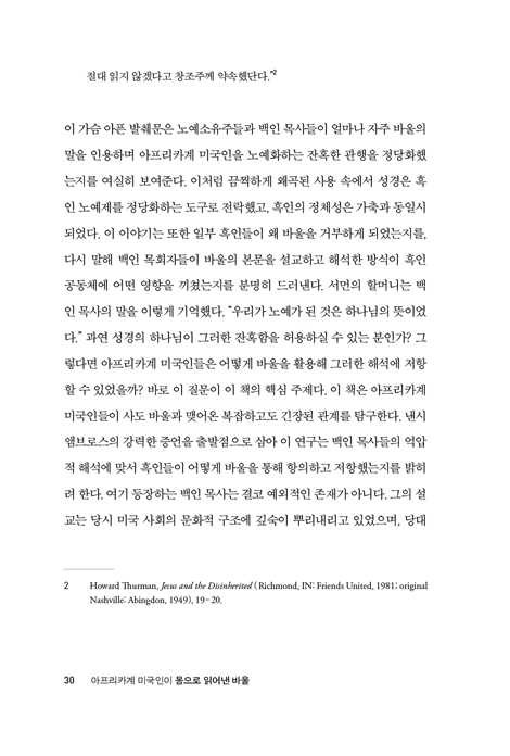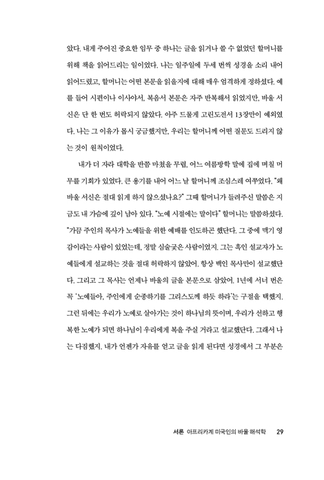 ³ë¿¹È­µÈ ¾ÆÇÁ¸®Ä«ÀεéÀÇ È¸½É ¹× ¼Ò¸í À̾߱⿡¼­ ¹Ù¿ïÀÇ ¾ð¾î°¡ ¾î¶»°Ô ¼ö¿ëµÇ¾ú°í, ¾î¶² ±â´ÉÀ» Çß´ÂÁö¸¦ °£·«È÷ »ìÆìº» ÀÌ ³íÀÇ´Â »çµµÀÇ ¾ð¾î°¡ ÈæÀεéÀÌ Çϳª´ÔÀ» ÀÌÇØÇϰí, ÀڽŵéÀ» À§ÇØ ¿ª»çÇϽô Çϳª´ÔÀÇ ´É·ÂÀ» ÀνÄÇÏ´Â µ¥ ÀÖ¾î ÇÙ½ÉÀûÀÎ ÇØ¼®ÀÇ Æ²À» Á¦°øÇßÀ½À» º¸¿©ÁØ´Ù. ½ÇÁ¦·Î ¼º°æÀÇ ¾ð¾î¿Í À̹ÌÁö´Â ÀÌ È¸½É À̾߱â Àü¹Ý¿¡ ½º¸çµé¾î ÀÖÀ¸¸ç, À̸¦ ÅëÇØ ¿ì¸®´Â ³ë¿¹È­µÈ ÀÚµéÀÇ »î ¼Ó¿¡ °³ÀÔÇϽŠÇϳª´ÔÀÇ ±¸Ã¼ÀûÀÎ ÇàÀ§µéÀ» ¿³º¼ ¼ö ÀÖ´Ù. ¼Î¸± »÷´õ½º(Cheryl Sanders)°¡ ÁöÀûÇϵí, ¡°[³ë¿¹µéÀº] ȸ½É °æÇèÀ» ÅëÇØ Á˾ÇÀ¸·Î °¡µæÇÑ ÀڽŵéÀÇ ¿µÈ¥À» º¯È­½ÃŰ½Å Çϳª´Ô²²¼­ ÁË·Î ¹°µç »çȸ ±¸Á¶ ¿ª½Ã º¯È­½ÃŰ½Ç °ÍÀ̶ó°í ¹Ï¾ú´Ù. ±×µéÀÇ ¿µÈ¥À» ÁË¿¡¼­ ÇØ¹æ½ÃŰ½Å Çϳª´ÔÀº ºÐ¸í ±×µéÀÇ À°Ã¼ ¶ÇÇÑ ³ë¿¹Á¦·ÎºÎÅÍ ÇØ¹æ½ÃŰ½Ç ¼ö ÀÖ´Â ºÐÀ̴̼Ù.¡± »÷´õ½ºÀÇ ÅëÂûÀº ³ë¿¹È­µÈ À̵éÀÌ ¿µÀû ÀÚÀ¯¿Í À°Ã¼Àû ÀÚÀ¯ »çÀÌ¿¡ ³»ÀçµÈ ±ä¹ÐÇÑ ¿¬°ü¼ºÀ» ºÐ¸íÈ÷ ÀνÄÇϰí ÀÖ¾úÀ½À» º¸¿©ÁØ´Ù. ±×µé¿¡°Ô ÀÖ¾î ÀÌ µÑÀº °áÄÚ ºÐ¸®µÉ ¼ö ¾ø´Â °ÍÀ̾ú´Ù.