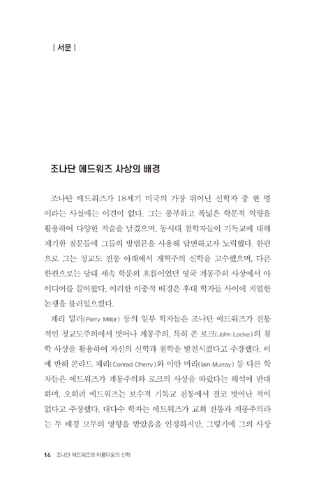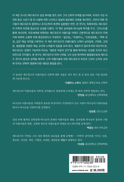 ÀÌ Ã¥Àº Á¶³ª´Ü ¿¡µå¿öÁîÀÇ ¼º°æ ÇØ¼®À» ·»Áî »ï¾Æ ±×ÀÇ ½ÅÇÐÀû ¹ÌÇÐÀ» ޱ¸Çϸç, ¹Ì±¹ÀÇ °¡Àå À§´ëÇÑ Á¾±³ »ç»ó°¡ Áß ÇÑ »ç¶÷¿¡ ´ëÇÑ ½Å¼±Çϰí Àý½ÇÈ÷ ÇÊ¿äÇß´ø °üÁ¡À» Á¦½ÃÇÑ´Ù. ÀÌÀüÀÇ Çй® ¿¬±¸µéÀÌ ¿¡µå¿öÁîÀÇ Ã¶ÇÐÀ̳ª Á¶Á÷½ÅÇÐÀû Ãø¸é¿¡ ÁýÁßÇß´ø ¹Ý¸é, º» ¿¬±¸´Â µ¶Æ¯ÇϰԵµ ¿¡µå¿öÁîÀÇ ¹ÌÇÐÀû ºñÀüÀ» Áß½ÉÀ¸·Î ¼º°æÀ» ´Ù·é´Ù. ÀÌ Ã¥Àº »ïÀ§ÀÏü Çϳª´Ô¿¡ »Ñ¸®¸¦ µÎ°í, ±×¸®½ºµµ¸¦ ÅëÇØ °è½ÃµÇ¸ç, ÇÇÁ¶¼¼°è¿¡ ¹Ý¿µµÇ´Â ¿¡µå¿öÁîÀÇ ¾Æ¸§´Ù¿ò ÀÌÇØ°¡ ±Ùº»ÀûÀ¸·Î ¿¡µå¿öÁîÀÇ ÁÖÇØ¼¿Í ¸ñȸÀû ¼Ò¸í¿¡ ÀÇÇØ Çü¼ºµÇ¾ú´Ù°í ÁÖÀåÇÑ´Ù. ¡º¼³±³Áý¡», ¡º¹Ì¼¿·¯´Ï¡», ¡º½Å¾Ó°¨Á¤·Ð¡», ¡º¿©¹é ¼º°æ¡» °°Àº ÇÙ½É ÀúÀÛÀ» ´Ù·ç¸é¼, ÀÌ Ã¥Àº ¿¡µå¿öÁîÀÇ ¾Æ¸§´Ù¿òÀÇ ½ÅÇÐÀÌ »ïÀ§ÀÏü, ±¸¿ø·Ð, ±³È¸·Ð, Á¾¸»·ÐÀ» Æ÷ÇÔÇÑ ÇÙ½É ±³¸®¿¡ ½º¸çµé¾î ÀÖÀ½À» º¸¿© ÁØ´Ù. °è¸ùÁÖÀÇ ÇÕ¸®ÁÖÀÇ¿Í ´ëÁ¶ÀûÀ¸·Î, ¿¡µå¿öÁî´Â ¼º·ÉÀÌ °¡´ÉÇÏ°Ô ÇϽô ¡°»õ·Î¿î ¸¶À½ÀÇ °¨°¢¡±À» ÅëÇØ ÇØ¼®µÇ´Â ¼º°æÀ» Áø¸®ÀÇ ÃÖ°í ¿øÃµÀ¸·Î ÁöÁöÇß´Ù. º» ¿¬±¸´Â ¿¡µå¿öÁîÀÇ ¹ÌÇÐ ½ÅÇÐÀ» ±×ÀÇ ¼º°æ ÇØ¼®Çаú ÅëÇÕÇÔÀ¸·Î½á ¿¡µå¿öÁî ¿¬±¸ÀÇ Áß¿äÇÑ °ø¹éÀ» ¸Þ¿ì¸ç, ½ÅÀû ¾Æ¸§´Ù¿ò¿¡ ´ëÇÑ ¿¡µå¿öÁîÀÇ ºñÀü°ú ±×°ÍÀÌ ½ÅÀÚ¿Í ±³È¸¿¡ ¹ÌÄ¡´Â º¯ÇõÀû ¿µÇâ¿¡ ´ëÇÑ »õ·Î¿î ÅëÂûÀ» ÁØ´Ù.