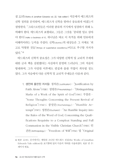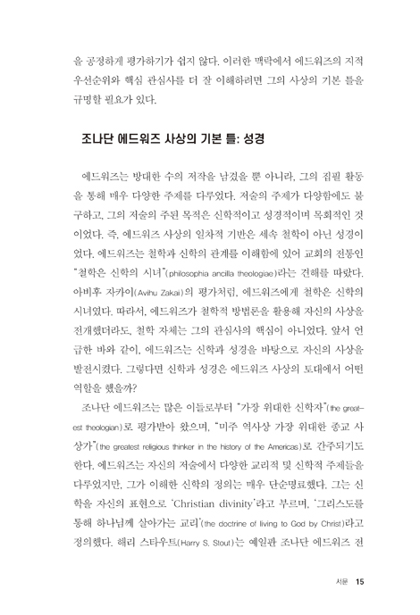 _½ºÄ± ¸¶³×Ä¡ Æ®¸®´ÏƼ º¹À½ÁÖÀÇ ½ÅÇб³ ±³È¸»ç ±³¼ö ÀÌ ³î¶ó¿î ¿¡µå¿öÁîÀÇ ¾Æ¸§´Ù¿òÀÇ ½ÅÇп¡ ´ëÇÑ Àú¼úÀº ³»°¡ ÃÖ±Ù ¸î ³â µ¿¾È ÀÐÀº °¡Àå Áß¿äÇÑ Ã¥ °¡¿îµ¥ Çϳª´Ù. ÀÌ Ã¥Àº ¿¡µå¿öÁîÀÇ ¹ÌÇп¡ ´ëÇÑ ¡®¼Ò¼öÁö¸¸ Á¡Á¡ Áõ°¡Çϴ¡¯ ¿¬±¸¿¡ Áß¿äÇÑ ±³Á¤À» Á¦½ÃÇϸç, ¿¡µå¿öÁî ÀÚ½ÅÀÌ ¿øÇßµíÀÌ ¾Æ¸§´Ù¿òÀÇ ½ÅÇÐÀ» ¼º°æ Áß½ÉÀ¸·Î ´Ù½Ã ¼¼¿î´Ù. ¶ÇÇÑ ¿¡µå¿öÁîÀÇ ¼º°æ ÇØ¼®¿¡ ´ëÇÑ Á¡Á¡ Áõ°¡ÇÏ´Â ¼Ò¼öÀÇ ¿¬±¸¸¦ ´õ¿í dz¼ºÇÏ°Ô ÇÏ¿©, Áß¼¼ ¼öµµ»çµéó·³ ¼º°æÀ» Á¶¸íÇϰí, ¿¡µå¿öÁîÀÇ ¹ÌÇÐÀÌ ¼º°æÀÇ ´Ù¾çÇÑ º»¹®°ú ÁÖÁ¦¿¡ ´ëÇÑ ±×ÀÇ ÀÛ¾÷¿¡ ¾î¶² ¹æ½ÄÀ¸·Î ¿µÇâÀ» ¹ÌÃÆ´ÂÁö¸¦ °Á¶ÇÑ´Ù. ÀÌÁ¦ ÀÌ Ã¥Àº ¸ðµç ÁøÁöÇÑ ¿¡µå¿öÁî ¿¬±¸ÀÚµé°ú ±Ù¼¼ Ãʱ⠰³½Å±³ ÁÖÇØ ¿¬±¸ÀÚµéÀÌ ¹Ýµå½Ã Àоî¾ß ÇÒ Çʵ¶¼´Ù. _´õ±Û¶ó½º ½ºÀ§´Ï »ùÆ÷µå ´ëÇб³ ºñ½¼ ½ÅÇкΠÇÐÀå ÀÌ Ã¥Àº ¿¡µå¿öÁîÀÇ ½ÅÇÐÀû ¹ÌÇÐÀÇ Åä´ë°¡ ´Ü¼øÇÑ Ã¶ÇÐÀû »çÀ¯³ª âÀÇÀû »ó»ó·ÂÀÌ ¾Æ´Ï¶ó, ¼º°æ¿¡ ´ëÇÑ Ä¡¹ÐÇÑ ÁÖÇØ¿Í ÇØ¼®À̾úÀ½À» º¸¿© ÁØ´Ù. ±è¿µ·¡ ¹Ú»ç¿¡°Ô À̰ÍÀº ¿¡µå¿öÁî°¡ ¸ñȸÀÚ-½ÅÇÐÀÚ¿´´Ù´Â Á¤Ã¼¼º°ú ÀÏÄ¡Çϸç, ¹Ì·¡ ¼¼´ë¸¦ À§ÇÑ Å¹¿ùÇÑ ¸ð¹üÀ» Á¦½ÃÇÑ´Ù. _Á¤¼º¿í µ§¹ö ½ÅÇб³ ±âµ¶±³ ½ÅÇÐ ±³¼ö ¸¹Àº ¿¡µå¿öÁî ¿¬±¸¿Í ±¸º°µÇ°Ô, ±è¿µ·¡ ¹Ú»ç´Â 1Â÷ ´ë°¢¼ºÀÇ ÁöµµÀÚÀÎ ¿¡µå¿öÁî°¡ °è¸ùÁÖÀÇ »ç»óÀ» ÃæºÐÈ÷ ÀνÄÇϸ鼵µ, ¼º°æ ÁÖÇØ¿Í ¼º°æ ÇØ¼®ÇÐÀ» ÅëÇØ ¾Æ¸§´Ù¿òÀÌ ÀÌÇØµÈ´Ù°í °¡¸£ÃÆÀ½À» º¸¿© ÁØ´Ù. ¡ºÁ¶³ª´Ü ¿¡µå¿öÁî¿Í ¾Æ¸§´Ù¿òÀÇ ½ÅÇС»Àº ¸¹Àº °¡Ä¡¸¦ ÇÔ²² ´ã¾Æ³½´Ù. Áï, ¹ÌÇÐÀÇ ±â¿ø¿¡ ´ëÇÑ °³°ü, ¹ÌÇп¡ ´ëÇÑ ÁÖ¿ä ½ÅÇÐÀÚµéÀÇ °ËÅä, ¿¡µå¿öÁî¿¡ ´ëÇÑ À̽ŷÐÀû ÇØ¼® ºñÆÇ ¹× ¿¡µå¿öÁîÀÇ ½ÅÇÐ ÁÖÁ¦µé°ú °¢°¢ÀÌ ±×ÀÇ ¾Æ¸§´Ù¿ò ÀÌÇØ¿Í ¾î¶»°Ô ¿¬°áµÇ´ÂÁö¿¡ ´ëÇÑ °£°áÇÑ Å½±¸´Ù. ±è¿µ·¡ ¹Ú»çÀÇ ÀÌ ¶Ù¾î³ Àú¼úÀº ¸ñȸÀÚ¿Í ÇÐÀÚµéÀÇ ¼Àç¿¡ ÈǸ¢ÇÏ°Ô ´õÇØÁú ¸¸ÇÑ Ã¥ÀÌ´Ù. _ÇÇÅÍ ¸±¹é Çʶóµ¨ÇÇ¾Æ ¿þ½ºÆ®¹Î½ºÅÍ ½ÅÇб³ ÃÑÀå ±è¿µ·¡ ¹Ú»çÀÇ ÀÌ Ã¥Àº Á¶³ª´Ü ¿¡µå¿öÁîÀÇ ¡®¾Æ¸§´Ù¿òÀÇ ½ÅÇС¯À» ½Åºñ·Ó°íµµ ¸í·áÇÏ°Ô µå·¯³»´Â ÇÑ ÆøÀÇ ½ÅÇÐÀû Á¤¿ø°úµµ °°´Ù. ±×´Â ¿¡µå¿öÁ ´Ü¼øÇÑ »ç»ó°¡°¡ ¾Æ´Ï¶ó, ¸»¾¸ ¼Ó¿¡¼ ¾Æ¸§´Ù¿òÀ» ¸Àº» ¼º°æÀû ½ÅÇÐÀÚ·Î ±×·Á ³½´Ù. ÀÌ Ã¥Àº ¹ÌÇÐÀ» »çº¯ÀÌ ¾Æ´Ñ ÁÖÇØ¿Í ¿¹¹èÀÇ ÀÚ¸®·Î µÇµ¹·Á ³õ´Â´Ù. Áø¸®ÀÇ ºûÀÌ °æ°ÇÀÇ ºÒ²É°ú ¸¸³ª´Â °÷, ±×°÷¿¡¼ ±è ¹Ú»ç´Â ¾Æ¸§´Ù¿òÀ» ½ÅÇÐÀÇ ½ÉÀåÀ¸·Î µÇ»ì¸®°í ÀÖ´Ù. ÀÌ Ã¥ÀÌ Áø¸®¸¦ ÇâÇÑ Áö¼ºÀÇ Å½±¸¸¦ ¿¹¹èÀÇ Âù¹Ì·Î ½ÂÈÇÏ¸ç ¸»¾¸ÀÇ Çй®°ú ±³È¸ÀÇ »îÀ» ÀÕ´Â °Å·èÇÑ Åë·Î·Î ³²À» °ÍÀ¸·Î È®½ÅÇÏ¸é¼ Çö´ë µ¶ÀÚµéÀÌ ²À Àϵ¶ÇÒ °ÍÀ» Àû±Ø ±ÇÇÑ´Ù. _¾ÈÀμ· ÃѽŴëÇб³ ½ÅÇдëÇпø ±³È¸»ç ±³¼ö Á¶³ª´Ü ¿¡µå¿öÁî´Â ¾Æ¿ì±¸½ºÆ¼´©½º, Ä®ºó, ¿ÀÀ¢, ¹ÙºùÅ© °°Àº ½ÅÇÐÀû °ÅÀåµé(giants)ÀÇ ¹Ý¿¿¡ ¼ÓÇÑ ½ÅÇÐÀÚ¿ä, ¸ñȸÀÚ¿ä, öÇÐÀÚ¿´´Ù. ´ë°¡µéÀÌ ±×·¨µíÀÌ ±×´Â ¾Õ¼± ÀüÅëÀ» Àß °è½ÂÇÏ´Â ÇÑÆí, ½Ã´ëÀÇ ¿©·¯ µµÀü¿¡ ¸Â¼¼ µ¿ÀÏÇÑ ¾ð¾î¿Í öÇÐÀÇ ¹«±â¸¦ ÃëÇÏ¿© ¼º°æÀû ±³¸®¸¦ º¯È£ÇÏ·Á´Â ³ë·ÂÀ» °æÁÖÇß´Ù. ±¹³»¿¡¼ ¿¡µå¿öÁî ¿¬±¸°¡ ºÕÀ» ÀÌ·ç±â ½ÃÀÛÇÑ °ÍÀº 21¼¼±â¿¡ µé¾î¼ÀÎ °Í °°´Ù. 2008³â¿¡ ³»°¡ ¿¡µå¿öÁîÀÇ ¼º·É·ÐÀ¸·Î ¹Ú»ç³í¹®À» ¾µ ¶§´Â Çѱ¹ÀÎÀ¸·Î¼ ¿©¼¸ ¹øÂ° ¾²´Â ³í¹®À̾úÁö¸¸, Á¦ÀÚ ±è¿µ·¡ ¹Ú»ç°¡ ½ºÀ§´ÏÀÇ Áöµµ ¾Æ·¡ ³í¹®À» ¿Ï¼ºÇßÀ» ¶§´Â 50-60¸í »çÀÌ¿¡ ¼ÓÇÒ Á¤µµ°¡ µÇ¾ú´Ù. ±×¸¸Å ±¹³»¿ÜÀûÀ¸·Î ¿¡µå¿öÁî¿¡ ´ëÇÑ °ü½É°ú ¿¬±¸ ¿±â°¡ ¶ß°Å¿ï »Ó ¾Æ´Ï¶ó Áö¼ÓÀûÀÌ¸ç ´õ¿í Ȱ¼ºÈµÇ°í ÀÖ´Ù. ±è ¹Ú»ç´Â º»¼¿¡¼ ¿¡µå¿öÁîÀÇ ¾Æ¸§´Ù¿òÀÇ ½ÅÇÐÀ» ¼º°æ ÇØ¼®¿¡ ±Ù°ÅÇÏ¿© ³í±¸ÇϵÇ, ±×ÀÇ »ç»óÀÇ ±Ù¿øÀ» ¹àÈ÷°í, ¾Æ¸§´Ù¿òÀÌ »ïÀ§ÀÏü Çϳª´ÔÀÇ ¼Ó¼ºÀÓÀ» Àû½ÃÇÏ°í ³ª¼, ±×·¯ÇÑ ¾Æ¸§´Ù¿òÀÌ ÇÇÁ¶¼¼°è¿¡ ¾î¶»°Ô ¹Ý¿µµÇ°í Àü´ÞµÇ¾ú´ÂÁö¿Í, Ÿ¶ô ÈÄ ±¸¼Ó »ç¿ª°ú ±³È¸¸¦ ÅëÇØ ¶ÇÇÑ ¾î¶»°Ô ±× ¾Æ¸§´Ù¿òÀÌ Àü´ÞµÇ°í º¯È¸¦ °¡Á®¿À´ÂÁö¸¦ ¹àÈ÷°í, ³ª¾Æ°¡¼´Â Á¾¸»·ÐÀûÀÎ ¼ºÃë(ÇÏ´Ã)¿¡ ´ëÇÑ ³íÀǸ¦ Á¦½ÃÇß´Ù. ¿¡µå¿öÁîÀÇ »ç»ó Áß ³í±¸ÀÇ ´ë»óÀÌ µÇÁö ¾ÊÀº ÁÖÁ¦°¡ ¾ø´Ù½ÃÇÇ Çϱ⿡, ¿¡µå¿öÁîÀÇ ¹ÌÇп¡ ´ëÇØ¼µµ 1968³â¿¡ ·Ñ¶û µé¶óÆ®¸£(Roland A. Delattre)°¡ ÃâÆÇÇÑ ¹Ú»ç³í¹®ÀÌ ¼±±¸ÀûÀÌÁö¸¸, º»¼°¡ °¡Áö´Â ÀåÁ¡°