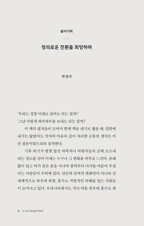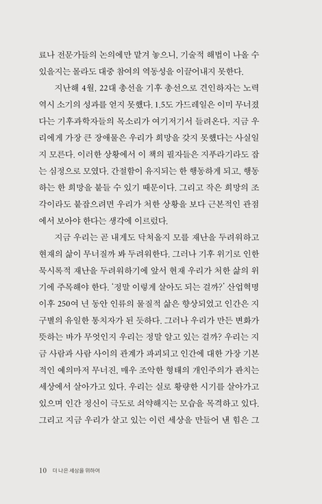 ¡°Á¤¸» ÀÌ·¸°Ô »ì¾Æµµ µÇ´Â °É±î?¡± Ã¥ ù¸Ó¸®ÀÇ ¹®Àå¿¡ ¸¶À½ÀÌ Äô ¶³¾îÁ³´Ù. ³» ¸¶À½À» ´Ã ²Ë ¸·°í ÀÖ´Â Áú¹®ÀÌ´Ù. ¿ì¸®°¡ Á¤¸» ÀÌ·¸°Ô »ì¾Æ°£´Ù¸é ¾ðÁ¦±îÁö »ì ¼ö ÀÖÀ»±î? Ǫ¸¥ º° Áö±¸´Â ¾ðÁ¦±îÁö Ǫ¸¦ ¼ö ÀÖÀ»±î? ÀÌ Áö±¸ÀÇ Á¸ÀçµéÀº °ú¿¬ ÀÌ·± À§±â »óȲÀ» ¶Õ°í »õ·Î¿î ¼¼»ó, ´õ ³ªÀº ¼¼»óÀ» º¼ ¼ö ÀÖÀ»±î? ÀÌ Ã¥Àº ±âÈÄ Àý¸ÁÀÇ ½Ã´ë¿¡ ¹¬Á÷ÇÏ°Ô ±Ùº»ÀûÀÎ Áú¹®À» ´Ù½Ã ´øÁø´Ù. ¡°¹Ì·¡´Â ¿©ÀüÈ÷ ¿ì¸® ¼Õ¿¡ ´Þ·Á ÀÖ°í, ¿ì¸®´Â ¿©ÀüÈ÷ ÃÖ¾ÇÀÇ »óȲÀ» ÇÇÇÒ ¼ö ÀÖ´Ù¡±´Â Èñ¸ÁÀ» ¸»ÇÏ´Â µ¥¼ ½Å½ÇÇÑ ½Å¾ÓÀεéÀÇ Åµµ°¡ º¸ÀδÙ. ÇÏÁö¸¸ µ¿½Ã¿¡ ¼²ºÒ¸® ½Å¾ÓÀÇ ¾ð¾î·Î ÇÇÇÏÁö ¾Ê°í, °¢ ºÐ¾ßº°·Î »óȲÀ» ³ÃÁ¤ÇÏ°Ô Áø´ÜÇϰí, ±¸Ã¼ÀûÀÎ ÇൿÀ» Ã˱¸ÇÏ´Â ÁøÁöÇÏ°í ½ÇõÀû ¸é¸ðµµ ÃæºÐÈ÷ °®Ãß°í ÀÖ´Ù. ±×·¯´Ï ÀÌ Ã¥Àº °¡Àå ³ÃöÇÑ ºÐ¼®À¸·Î, ±×·¯³ª ¶ß°Å¿î °¡´É¼ºÀ¸·Î ¡®´õ ³ªÀº ¼¼»ó¡¯À» ã¾Æ°¡´Â ½Å¾ÓÀεéÀÇ ¿ìÁ÷ÇÑ °ÉÀ½ ±× ÀÚüÀÌ´Ù. ¡°´õ ³ªÀº ¼¼»ó, »õ·Î¿î ¼¼»óÀÌ °¡´ÉÇÏ´Ù!¡±¶ó´Â Èñ¸ÁÀº ¸·¿¬ÇÑ ±â´ë°¡ ¾Æ´Ï¶ó, ¡°¿ì¸®°¡ ¡®ÇöÀ硯¸¦ Çϳª´ÔÀÌ ÇൿÇ϶ó°í ºÎ¸£´Â °áÁ¤ÀûÀÎ ½ÃÁ¡À¸·Î ¹Þ¾ÆµéÀÌ´Â ÇÑ¡± °¡´ÉÇÑ Çö½ÇÀÓÀ» ¼±¾ðÇÏ´Â °·ÂÇÑ Çൿ ÁöħÀÌ´Ù.