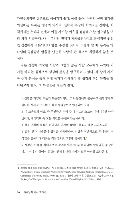 ÃÑ 4ºÎ·Î ±¸¼ºµÈ ÀÌ Ã¥Àº ¼º°æ¿¡¼ Çϳª´ÔÀÌ ¾î¶»°Ô ¸»¾¸ÇϽôÂÁö, Çϳª´ÔÀÌ ´©±¸½ÅÁö, Çϳª´ÔÀÌ ¹«¾ùÀ» ÇϽôÂÁö, ±×¸®°í ¿ì¸®°¡ ¾î¶»°Ô ÀÀ´äÇØ¾ß ÇÏ´ÂÁö¸¦ ´Ù·é´Ù. 2ºÎ, 3ºÎ, 4ºÎÀÇ °¢ ÀåÀº ÇÑ ÁÖÁ¦¸¦ ±× ½ÃÀÛ¿¡¼ºÎÅÍ ±×¸®½ºµµ ¾È¿¡ ³ªÅ¸³ ¸ñÇ¥ ¹× »õ Çϴðú »õ ¶¥¿¡¼ÀÇ ¿Ï¼º¿¡ À̸£±â±îÁö »ìÇǸé¼, ¼º°æÀ» ±¸¼Ó»çÀû µå¶ó¸¶¶ó´Â °üÁ¡¿¡¼ Àеµ·Ï ¿ì¸®¸¦ ÃÊ´ëÇÑ´Ù. ¼º°æÀÇ ¸ðµç À̾߱⸦ ÇϳªÀÇ ±¸¼Ó»çÀû µå¶ó¸¶·Î Àо´Â ÀÏÀº ÇØ¼®ÀÇ ±â¼úÀÌ ¾Æ´Ï¶ó Çϳª´ÔÀÇ °è½Ã¸¦ ½ÅÇÐÀûÀ¸·Î ÅëÀüÇÏ´Â ¾È¸ñÀÇ °á½ÇÀ̸ç, ¡ºÇϳª´ÔÀÇ °è½Ã µå¶ó¸¶¡»´Â ±× ¾È¸ñÀÇ Á¤¼ö¸¦ º¸¿© ÁØ´Ù. µ¶ÀÚµéÀº ÀÌ Ã¥À» ÀÐ¾î ³ª°¨À¸·Î½á ¼º°æÀÇ Å« ±×¸²À», ¼º°æ Àüü¸¦ °üÅëÇÏ´Â Çϳª´ÔÀÇ ±¸¼Ó ¸ñÀûÀ» Àç¹ß°ßÇÏ°Ô µÉ °ÍÀÌ´Ù.