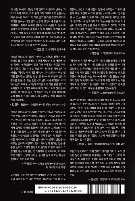 Ç츣¸¸ ¹ÙºùÅ©ÀÇ ¡ºÇϳª´ÔÀÇ À§´ëÇÑ »ç¿ª¡»ÀÌ ´Ù½Ã ¿ì¸®¸» ·Î Ãâ°£µÇ´Â °ÍÀº ¿ì¸®¿¡°Ô Å« º¹ÀÌ´Ù. Ç츣¸¸ ¹ÙºùÅ©°¡ 20¼¼±â ÃÊ ÀÌ Ã¥À» ¼¼»ó¿¡ ³»³õÀ» ¶§ °¡Á³´ø ±× ¸¶À½À» À̾î 21¼¼±â Ãʸ¦ »ì¾Æ°¡´Â ¿ì¸® ¿ª½Ã ¿ì¸® ½Ã´ëÀÇ ¹ÙºùÅ© ¿ªÇÒÀ» °¨´çÇØ ¿À´ÃÀÇ ¾ð¾î·Î Çϳª´ÔÀÇ À§´ëÇÑ »ç¿ª(Magnalia Dei)À» Áõ¾ðÇÒ ¼ö Àֱ⸦ ¹Ù¶õ´Ù. Ãʱ⠱³È¸ ¿À¼øÀý »ç°Çó·³ ¿À´ÃÀÇ »ç¶÷µéµµ ±× º¹À½ÀÇ ¸»¾¸À» Àß ¾Ë¾ÆµéÀ» ¼ö ÀÖÀ¸·Á¸é, ¿ì¸® ¸ðµÎ°¡ ÀÌ Ã¥À» ºÎÁö·±È÷ ÀÐ°í ±× ³»¿ë¿¡ ÀÀ´äÇÏ¿© ¸»ÇÏ°í »ì¾Æ³»¾ß ÇÒ °ÍÀÌ´Ù. ÀÌ ±ÍÇÑ ÀÛ¾÷À» °¨´çÇÑ À̵¿¿µ ±³¼ö¿Í »õ¹°°áÇ÷¯½º ÃâÆÇ»ç¿¡ ±íÀÌ °¨»çµå¸°´Ù.