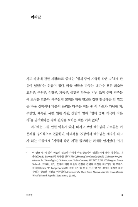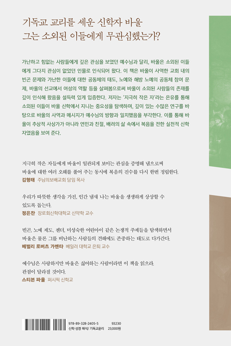Áö±ØÈ÷ ÀÛÀº ÀÚ¿¡ ´ëÇÑ ¹Ù¿ïÀÇ °ü½ÉÀº ŸÀÎÀ» ÇâÇÑ ÀνĿ¡ ±×Ä¡Áö ¾Ê´Â´Ù. ±×´Â Àڽŵµ ¡°»çµµ Áß¿¡ °¡Àå ÀÛÀº ÀÚ¡±·Î ÀνÄÇß´Ù. »çµµ¶ó ºÒ¸± ÀÚ°ÝÀÌ ¾ø´Â ÀÚ¸¦ ±×¸®½ºµµ²²¼ ºÒ·¯ Á̴ּٴ ÀÌ ÀÚ±â ÀνÄÀº °¡³ÇÑ ÀÚ, ³ë¿¹, ¿©¼º, À̹æÀεéó·³ ¼Ò¿ÜµÈ À̵éÀ» ÇâÇÑ º¹À½ ÀüÆÄÀÇ »ç¸í¿¡µµ Å« ¿µÇâÀ» ³¢ÃÆ´Ù. ·Î¸¶°¡ Áö¹èÇÏ´ø 1¼¼±â »çȸ¿¡¼ ¹Ù¿ïÀº ¸ðµç »ç¶÷¿¡°Ô ±â²¨ÀÌ ³ë¿¹°¡ µÇ·Á Çß°í, ±³È¸ °øµ¿Ã¼¸¦ ÇâÇØ¼µµ ¼·ÎÀÇ Á¾ÀÌ µÇ¶ó°í ¸»Çß´Ù. ¹Ù¿ïÀº ´ç´ë¿¡ ºÎÁ¶¸®ÇÑ Çö½Ç¿¡ ´ëÇØ üÁ¦ Àüº¹ÀûÀÎ ÁÖÀåÀ» ¼Ò¸® ³ô¿© Á¦±âÇÏÁö´Â ¾Ê¾ÒÁö¸¸, ¡°Áö±ØÈ÷ ÀÛÀº ÀÚ¡±·Î¼ ÀÚ½ÅÀÇ Á¤Ã¼¼ºÀ» ºÐ¸íÈ÷ ÀνÄÇß´Ù. ÀúÀÚ´Â ÀÌ·± »ý°¢¿¡ ¹ÙÅÁÀ» µÐ ±×ÀÇ »ç¿ªÀÌ °¡³ÇÑ ÀÚµéÀ» À§ÇÑ ±×¸®½ºµµÀÇ »ç¿ª°ú À̾îÁ® ÀÖÀ½À» ¸íÈ®È÷ º¸¿© ÁØ´Ù.