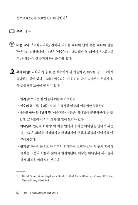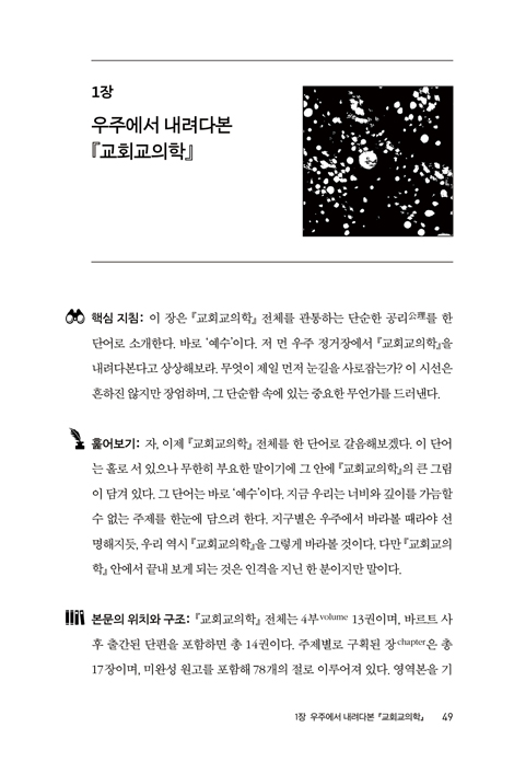 ¡º½±°Ô Àд Į ¹Ù¸£Æ® ±³È¸±³ÀÇÇÐ: 1ºÎ Çϳª´ÔÀÇ ¸»¾¸¿¡ °üÇÑ ±³ÀÇ¡»´Â ÀÌ ½Ã¸®Áî Áß Ã¹ ¹øÂ° Ã¥À¸·Î, ¡º±³È¸±³ÀÇÇС»ÀÇ 1ºÎ 1±Ç°ú 1ºÎ 2±Ç, ÀåÀ¸·Î´Â Á¦4Àå±îÁö, Àý·Î´Â 23Àý±îÁö¸¦ ´Ù·é´Ù.[¡º±³È¸±³ÀÇÇС»Àº 4ºÎ(volume), 13±ÇÀ¸·Î ÀÌ·ç¾îÁ® ÀÖÀ¸¸ç, ¹Ù¸£Æ® »çÈÄ Ãâ°£µÈ ´ÜÆíÀ» Æ÷ÇÔÇϸé ÃÑ 14±ÇÀÌ´Ù. ÁÖÁ¦º°·Î ±¸È¹µÈ Àå(chapter)Àº ¸ðµÎ 17Àå, ¹Ì¿Ï¼º ¿ø°í¸¦ Æ÷ÇÔÇϸé 78°³ÀÇ Àý(paragraph)ÀÌ ÀÖ´Ù.]
