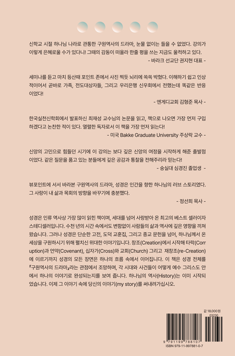 ¼º°æÀº Àηù ¿ª»ç»ó °¡Àå ¸¹ÀÌ ÀÐÈù Ã¥À̸ç, ¼¼´ë¸¦ ³Ñ¾î »ç¶û¹Þ¾Æ ¿Â ÃÖ°íÀÇ º£½ºÆ®¼¿·¯ÀÌÀÚ ½ºÅ׵𼿷¯ÀÔ´Ï´Ù. ¼öõ ³âÀÇ ½Ã°£ ¼Ó¿¡¼µµ º¯ÇÔ¾øÀÌ »ç¶÷µéÀÇ »î°ú ¿ª»ç¿¡ ±íÀº ¿µÇâÀ» ³¢ÃÄ ¿Ô½À´Ï´Ù. ±×·¯³ª ¼º°æÀº ´Ü¼øÇÑ °íÀü, µµ´ö ±³ÈÆÁý, ±×¸®°í Á¾±³ ¹®ÇåÀ» ³Ñ¾î, Çϳª´Ô²²¼ ¿Â ¼¼»óÀ» ±¸¿øÇϽñâ À§ÇØ ÆîÄ¡½Å À§´ëÇÑ À̾߱âÀÔ´Ï´Ù. âÁ¶(Creation)¿¡¼ ½ÃÀÛÇØ Ÿ¶ô(Corruption)°ú ¾ð¾à(Covenant), ½ÊÀÚ°¡(Cross)¿Í ±³È¸(Church) ±×¸®°í ÀçâÁ¶(re-Creation)¿¡ À̸£±â±îÁö ¼º°æÀÇ ¸ðµç Àå¸éÀº ÇϳªÀÇ È帧 ¼Ó¿¡¼ À̾îÁý´Ï´Ù. ÀÌ Ã¥Àº ¼º°æ Àüü¸¦ ¡º±¸¿ø¿ª»çÀÇ µå¶ó¸¶¡»¶ó´Â °üÁ¡¿¡¼ Á¶¸ÁÇϸç, °¢ ½Ã´ë¿Í »ç°ÇµéÀÌ ¾î¶»°Ô ¿¹¼ö ±×¸®½ºµµ ¾È¿¡¼ ÇϳªÀÇ À̾߱â·Î ¿Ï¼ºµÇ´ÂÁö¸¦ º¸¿© ÁÝ´Ï´Ù. Çϳª´ÔÀÇ ¿ª»ç(History)´Â ÀÌ¹Ì ½ÃÀ۵Ǿú½À´Ï´Ù. ÀÌÁ¦ ±× À̾߱⠼ӿ¡ ´ç½ÅÀÇ À̾߱â(my story)¸¦ ½á ³»·Á°¡½Ê½Ã¿À.