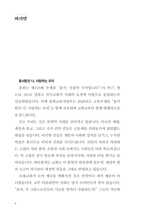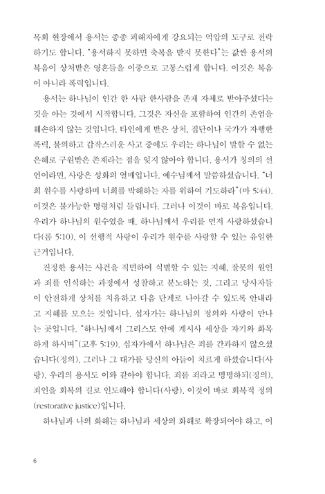 ¸ñȸ ÇöÀå¿¡¼ ¿ë¼´Â Á¾Á¾ ÇÇÇØÀÚ¿¡°Ô °¿äµÇ´Â ¾ï¾ÐÀÇ µµ±¸·Î Àü¶ôÇϱ⵵ ÇÕ´Ï´Ù. ¡°¿ë¼ÇÏÁö ¸øÇϸé ÃູÀ» ¹ÞÁö ¸øÇÑ´Ù¡±´Â °ª½Ñ ¿ë¼ÀÇ º¹À½ÀÌ »óó¹ÞÀº ¿µÈ¥µéÀ» ÀÌÁßÀ¸·Î °íÅ뽺·´°Ô ÇÕ´Ï´Ù. À̰ÍÀº º¹À½ÀÌ ¾Æ´Ï¶ó Æø·ÂÀÔ´Ï´Ù. ¿ë¼´Â Çϳª´ÔÀÌ Àΰ£ ÇÑ »ç¶÷ ÇÑ»ç¶÷À» Á¸Àç ÀÚü·Î ¹Þ¾ÆÁ̴ּٴ °ÍÀ» ¾Æ´Â °Í¿¡¼ ½ÃÀÛÇÕ´Ï´Ù. ±×°ÍÀº ÀÚ½ÅÀ» Æ÷ÇÔÇÏ¿© Àΰ£ÀÇ Á¸¾öÀ» ÈѼÕÇÏÁö ¾Ê´Â °ÍÀÔ´Ï´Ù. ŸÀο¡°Ô ¹ÞÀº »óó, Áý´ÜÀ̳ª ±¹°¡°¡ ÀÚÇàÇÑ Æø·Â, ºÒÀÇÇÏ°í °©ÀÛ½º·¯¿î »ç°í Áß¿¡µµ ¿ì¸®´Â Çϳª´ÔÀÌ ¸»ÇÒ ¼ö ¾ø´Â ÀºÇý·Î ±¸¿ø¹ÞÀº Á¸Àç¶ó´Â Á¡À» ÀØÁö ¾Ê¾Æ¾ß ÇÕ´Ï´Ù. ¿ì¸®´Â ´ÙÀ½¼¼´ë¿¡°Ô »ý¸íÀÇ º¹À½À» Àü´ÞÇØ¾ß ÇÕ´Ï´Ù. º¹À½ÀÇ ÇÙ½ÉÀº ¿ë¼¿Í »ç¶ûÀÔ´Ï´Ù. ¿ì¸®´Â ´ÙÀ½¼¼´ë°¡ ºÐ¿µÈ ¼¼»óÀ» Ä¡À¯ÇÏ´Â Çϳª´Ô ³ª¶óÀÇ ÁõÀÎÀ¸·Î ¼ºÀåÇϵµ·Ï ±³À°ÇØ¾ß ÇÕ´Ï´Ù. À̰ÍÀÌ Çѱ¹±³È¸ÀÇ »õ·Î¿î Èñ¸ÁÀÔ´Ï´Ù. ÀúÀÚ ¹× ¿ªÀÚ ¼Ò°³