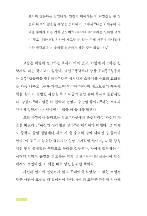 Àΰ£ÀÌ Á¸ÀçÇÏ´Â °¡Àå Å« ÀÌÀ¯´Â Çϳª´ÔÀ» ¿µÈ·Ó°Ô ÇÏ°í ±×ºÐÀ» Áñ°Å¿öÇÏ´Â °ÍÀÌ´Ù. ±×·±µ¥ ¿À´Ã³¯ ¸¹Àº À̵鿡°Ô ±âµ¶±³ÀÇ Çϳª´ÔÀº ±×Àú ¡®º¹À» º£Çª´Â ¸ðÈ£ÇÑ ¼±ÀÇÀÇ Á¸À硯°Å³ª ¡®Çϴÿ¡ Åõ»çµÈ ³» ÀÚ¾ÆÀÇ È®´ëÆÇ¡¯, ¡®ºñÀ§ ¸ÂÃß±â Èûµç ½É»çÀ§¿ø¡¯¿¡ ºÒ°úÇÏ´Ù. µµ´ëü ¿ì¸®°¡ ¹Ï´Â Çϳª´ÔÀº ´©±¸Àΰ¡? ´õ´Â Çϳª´ÔÀ» ±Ã±ÝÇØÇÏÁöµµ ¾Ö½á ¾Ë¾Æº¸·Á ÇÏÁöµµ ¾Ê´Â ¼¼´ë, °æ¿ÜÇÔÀ» ÀÒ¾î¹ö¸° ¿À´Ã³¯ÀÇ ±×¸®½ºµµÀε鿡°Ô °·ÂÇÑ ÃÊ´ëÀåÀÌ ³¯¾Æ¿Ô´Ù.