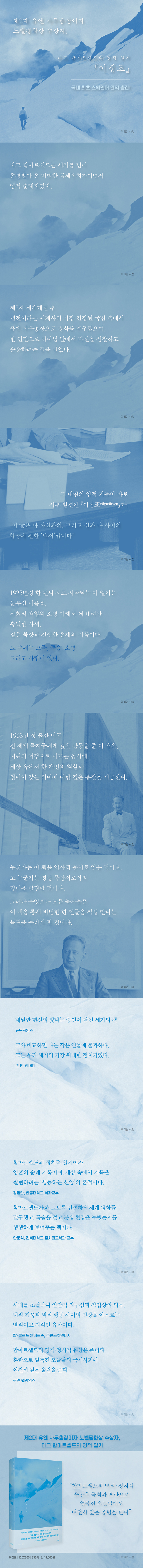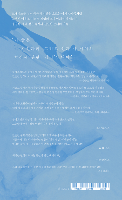 ´Ù±× ÇÔ¸¶¸£¼Ðµå´Â ¿Ü±³°üÀÌÀÚ ±¹Á¦Á¤Ä¡°¡ÀÌ¸é¼ ¿µÀû ¼ø·ÊÀÚ¿´´Ù. ±×´Â ³ÃÀüÀ̶ó´Â ¼¼°è»çÀÇ °¡Àå ±äÀåµÈ ±¹¸é¼Ó¿¡¼ À¯¿£ »ç¹«ÃÑÀåÀ¸·Î Æòȸ¦ Ãß±¸ÇßÁö¸¸, µ¿½Ã¿¡ ÇÑ Àΰ£À¸·Î Çϳª´Ô ¾Õ¿¡¼ ÀÚ½ÅÀ» ¼ºÂûÇÏ°í ¼øÁ¾ÇÏ·Á´Â ±æÀ» °É¾ú´Ù. ±× ³»¸éÀÇ ±â·ÏÀÌ ±×ÀÇ »çÈÄ¿¡ ¹ß°ßµÈ ¡ºÀÌÁ¤Ç¥¡»´Ù. ÇÔ¸¶¸£¼Ðµå´Â À̸¦ ¡°³ª ÀڽŰúÀÇ, ±×¸®°í ½Å°ú ³ª »çÀÌÀÇ Çù»ó¿¡ °üÇÑ ÀÏÁ¾ÀÇ ¡®¹é¼¡¯¡±¶ó°í ºÒ·¶´Ù. ÀÌ ¸»Àº ¡ºÀÌÁ¤Ç¥¡» Àüü¸¦ °üÅëÇÏ´Â ½ÅÇÐÀû ÇÙ½ÉÀ» ¿ä¾àÇÑ´Ù.