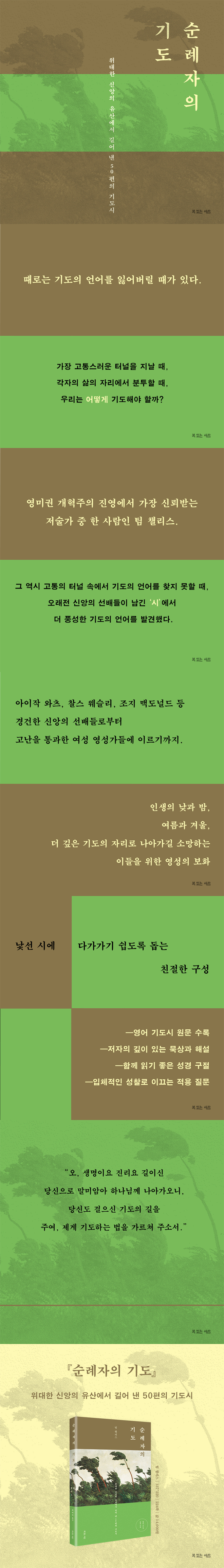 ¡º¼ø·ÊÀÚÀÇ ±âµµ¡»´Â ´õ ±íÀº ±âµµÀÇ ÀÚ¸®·Î ³ª¾Æ°¡±æ ¼Ò¸ÁÇÏ´Â À̵éÀ» ¾Õ¼ °É¾î°£ ¹ÏÀ½ÀÇ °ÅÀÎµé ¾î±ú À§¿¡ ¿Ã·Á³õ´Â´Ù. ÀÌ Ã¥Àº ¡®»õ ³ë·¡¡¯¸¦ ¼Ò¸ÁÇϸç ÁÖ´ÔÀ» ÇâÇÑ »ç¶û°ú ¼øÁ¾ ¾È¿¡¼ Àڶ󰡱⸦ °¥¸ÁÇÏ´Â ¿ì¸® ½Ã´ë ±×¸®½ºµµÀε鿡°Ô ´õ¾øÀÌ ±ÍÇÑ ±âµµÀÇ ±æÀâÀ̰¡ µÉ °ÍÀÌ´Ù.