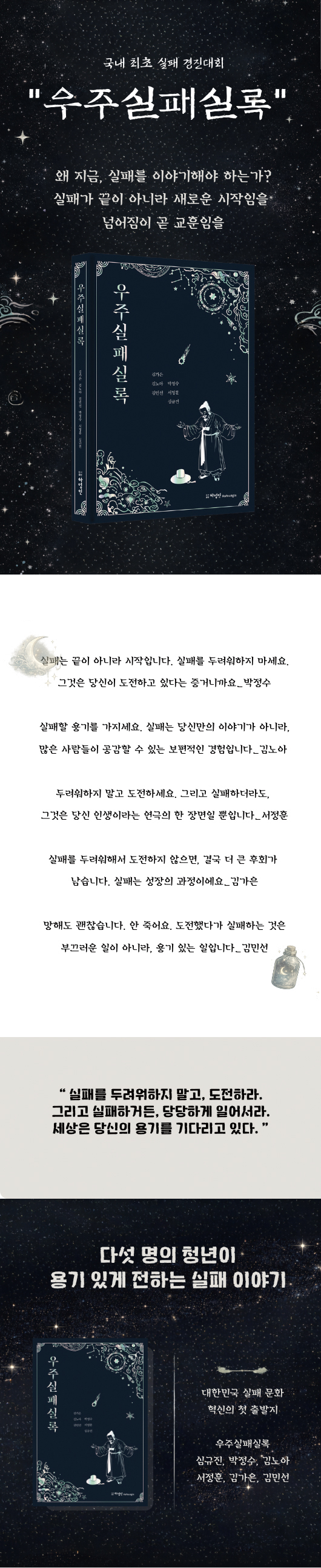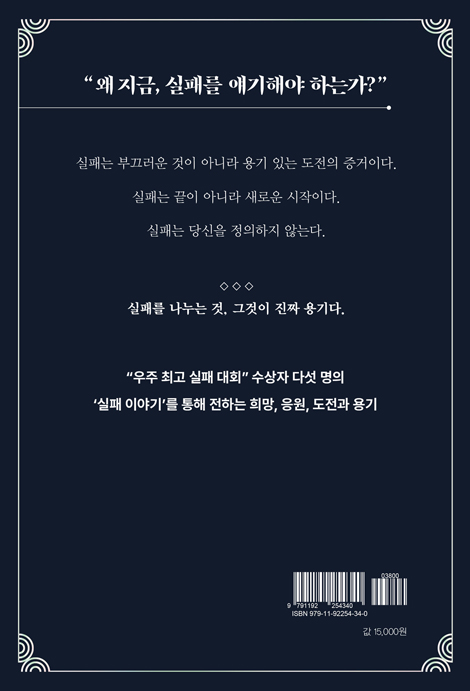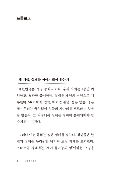¡®¿Ö Áö±Ý, ½ÇÆÐ¸¦ ¾ê±âÇØ¾ß Çϴ°¡?¡¯ ÀÌ ¹°À½À» ´øÁö¸ç ¡®½ÇÆÐÇÏ¸é ³¡¡¯À̶ó´Â ´ëÇѹα¹ÀÇ ¿À·¡µÈ °ø½Ä¿¡ À¯ÄèÇÏ°Ô µýÁö¸¦ °Å´Â Ã¥ÀÌ´Ù. ÇÇÀÚ¸¦ Å¿ö¹ö¸° ¾î¸° ½ÃÀýÀÇ ½Ç¼öºÎÅÍ, 34¹øÀÇ °ø¸ðÀü ³«¼±, ¹«´ë À§¸¦ ²Þ²Ù´Ù ÁÂÀýÇÑ Ã»³âÀÇ À̾߱â±îÁö ÀÌ Ã¥¿¡´Â Àß³ª°¡Áö ¸øÇÑ ¼ø°£µéÀÌ ´ç´çÈ÷ ÁÖÀΰøÀ¸·Î µîÀåÇÑ´Ù. Àü±¹ ÃÖÃÊ·Î ¿¸° ¡°¿ìÁÖ ÃÖ°í ½ÇÆÐ ´ëȸ¡± ¼ö»óÀÚ 5ÀÎÀÇ ½ÇÆÐ´ã°ú ±×µéÀÇ À̾߱⸦ ±íÀÌ ÀÖ°Ô ´Ù·é ÀÎÅÍºä ³»¿ëÀÌ ´ã°ÜÀÖ´Ù. ¼º°ø´ãÀº ³ÑÃijªÁö¸¸ ½ÇÆÐ´ãÀº ±ÍÇÑ ½Ã´ë¿¡ ÀÌ Ã¥Àº ¸»ÇÑ´Ù. ½ÇÆÐ´Â ¿ë±â ÀÖ´Â µµÀüÀÇ Áõ°ÅÀ̸ç, »õ·Î¿î ½ÃÀÛÀÌ°í ½ÇÆÐ´Â ´ç½ÅÀ» Á¤ÀÇÇÏÁö ¾ÊÀ¸¸ç, ½ÇÆÐ¸¦ ³ª´©´Â °ÍÀÌ ÁøÂ¥ ¿ë±âÀÓÀ».