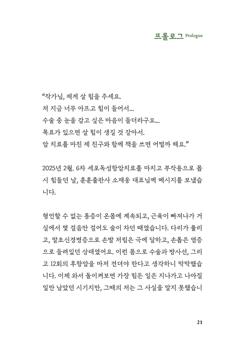 ¡°ÀÌ Ã¥Àº ´ÜÁö ¾ÏÀ» Áø´Ü¹Þ°í À̰ܳ»´Â °Í¿¡ ±×Ä¡´Â À̾߱Ⱑ ¾Æ´Ï´Ù. ¡®Åõº´ÀÌ¶ó ¸»ÇÏ°í ½ÍÁö ¾Ê´Ù¡¯¶ó´Â ÀúÀÚÀÇ °á½Éó·³ ÀλýÀ» »ì¾Æ³»´Â ŵµ¸¦ ¸»Çϰí ÀÖ´ÂÁöµµ ¸ð¸¥´Ù. ¿ì¸®´Â ¸ðµÎ ¿¹ÃøÇÒ ¼öµµ, ÅëÁ¦ÇÒ ¼öµµ ¾ø´Â ºÒ¾ÈÇÑ »îÀÇ ÇѰ¡¿îµ¥ ÀÖ´Ù. ±×·¸´Ù¸é »îÀ» ¸ØÃß°Ô ÇÏ´Â »ç°Ç ¾Õ¿¡¼, ¾î¶»°Ô ´Ù½Ã ÀϾ ¡®³ª¡¯·Î »ì¾Æ°¥ ¼ö ÀÖÀ»±î? ÀÌ Ã¥Àº ±× Áö³ÇÏ°íµµ ´Ü´ÜÇÑ ¿©Á¤À» ¶§·Î´Â ¾ÆÇÁ°Ô, ¶§·Î´Â ´ã´ãÇϰÔ, ¶§·Î´Â ÀÛ°¡ ƯÀ¯ÀÇ À§Æ®·Î ¸»Çϰí ÀÖ´Ù. Á×À» °Å °°Àº ³¯µµ ÇÑ ÁÙ±â Ç޻쿡¼ ȯÈñ¸¦ ãµí ½½ÇÄÀ» µ¤°íµµ ³²´Â °ÍÀº °á±¹ »ç¶ûÀÓÀ» ±â¾îÄÚ º¸¿©ÁØ´Ù. °íÅëÀ» ¿À·ÔÀÌ °¨³»ÇÑ »ç¶÷¸¸ÀÌ ´ãÀ» ¼ö ÀÖ´Â µÎ ÀÛ°¡ÀÇ ¼ÖÁ÷ÇÑ ¾ð¾î°¡, ¼ö¸¹Àº ÀλýÀÇ ¹®Á¦·Î ÁöÄ£ µ¶Àڵ鿡°Ô µûµíÇÑ À§·Î°¡ µÇ¾îÁÖ±æ ¹Ù¶õ´Ù.