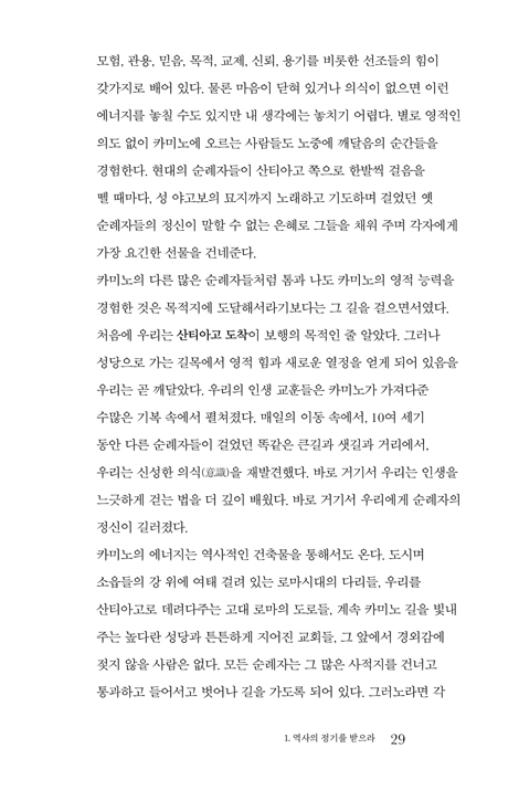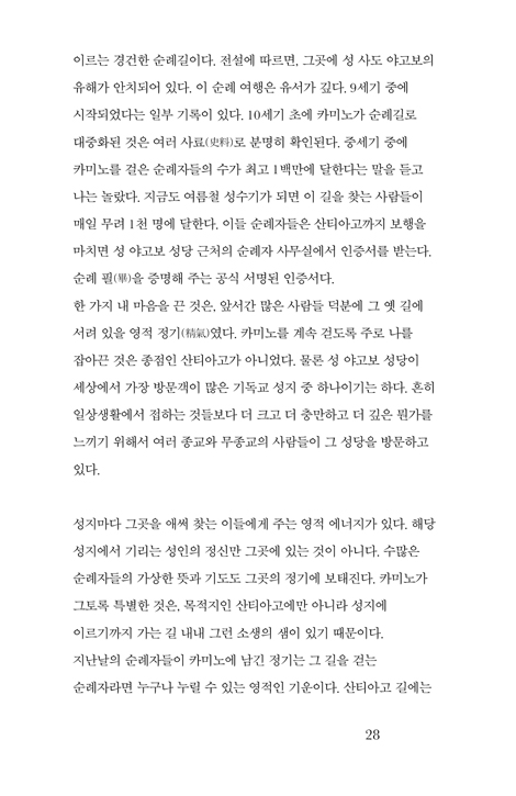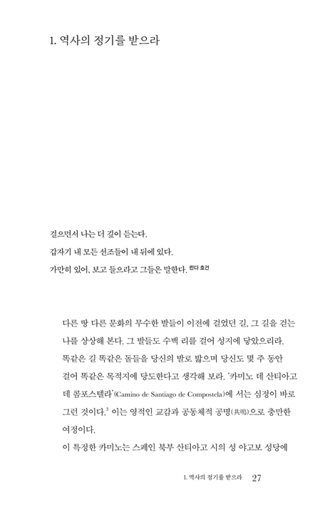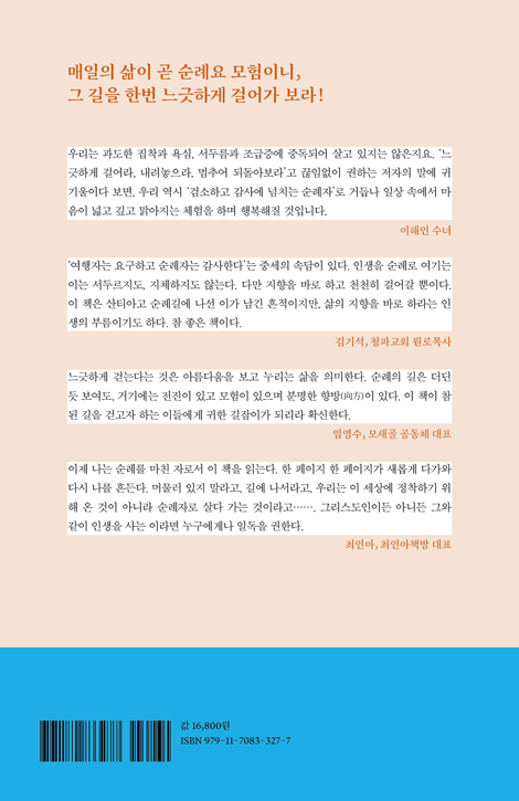ÀÛ³â 5¿ù, ³ª´Â »êƼ¾Æ°í ¼ø·Ê¸¦ ¶°³ª 8¹é ų·Î¹ÌÅÍ¿¡ À̸£´Â ¸Õ ±æÀ» 36ÀÏ µ¿¾È °É¾ú´Ù. µ¹ÀÌÄѺ¸¸é Âü ÀÌ»óÇÑ ÀÏÀ̾ú´Ù. ³»°Ô´Â µüÈ÷ ±×°÷¿¡ °¡¾ß ÇÒ µ¿±â°¡ ¾ø¾ú´Ù. ¼º ¾ß°íº¸ÀÇ À¯Çذ¡ ¹¯Çô ÀÖ´Ù´Â »êƼ¾Æ°í ´ë¼º´çÀ» ±»ÀÌ ³» ´«À¸·Î ºÁ¾ß ÇÒ ÀÌÀ¯µµ ¾ø¾ú°í, ³ª´Â ±×¸®½ºµµÀεµ ¾Æ´Ï¾ú´Ù. ü·Âµµ ±× ¸Õ ±æÀ» °¨´çÇϱ⿡´Â ÅξøÀÌ ºÎÁ·Çß´Ù. ±×·³¿¡µµ ³ª´Â ¶°³µ°í, °È´Â ³»³» ¡®¿Ö ³»°¡ ÀÌ ±æ¿¡ ¼ Àִ°¡¡¯¸¦ ¹¯´Â ±âÀÌÇÑ ¼ø·ÊÀÚ¿´´Ù. ±×·¯´Ù °á±¹Àº ±× ¼ø°£°ú ¸Â´Ú¶ß¸®°í¾ß ¸»¾Ò´Ù. ¹ã»õ ³»¸° ºñ°¡ ¾ÆÄ§¿¡µµ ¸ÜÁö ¾Ê¾Æ ¿Â¸öÀ¸·Î ºñ¸¦ ¸ÂÀ¸¸ç °È´ø 6¿ùÀÇ ¾î´À ¾ÆÄ§, ¼Ó¿¡¼ºÎÅÍ ¹«¾ð°¡°¡ º¹¹ÞÃÄ ¿Ã¶ú°í, ÅÍÁ® ³ª¿Â ¿ïÀ½ µÚ¿¡¾ß ºñ·Î¼Ò ¾Ë ¼ö ÀÖ¾ú´Ù. ³»°¡ ¿Ö ±× ±æ¿¡ ¼ ÀÖÀ¸¸ç, ´©°¡ ³ª¸¦ ±×°÷À¸·Î À̲ø¾ú´ÂÁö. ¼ø·Ê¸¦ ¶°³ª±â Àü, ¼ö³à´ÔÀÇ ¼ø·Ê±â°¡ ÀÖ´Ù´Â ¸»À» µè°í ÀÐ°í ½Í¾úÁö¸¸ ±×¶§´Â ¾ÆÁ÷ ¹ø¿ªº»ÀÌ ³ª¿À±â ÀüÀ̾ú´Ù. ÀÌÁ¦ ³ª´Â ¼ø·Ê¸¦ ¸¶Ä£ Àڷμ ÀÌ Ã¥À» Àд´Ù. ÇÑ ÆäÀÌÁö ÇÑ ÆäÀÌÁö°¡ »õ·Ó°Ô ´Ù°¡¿Í ´Ù½Ã ³ª¸¦ Èçµç´Ù. ¸Ó¹°·¯ ÀÖÁö ¸»¶ó°í, ±æ¿¡ ³ª¼¶ó°í, ¿ì¸®´Â ÀÌ ¼¼»ó¿¡ Á¤ÂøÇϱâ À§ÇØ ¿Â °ÍÀÌ ¾Æ´Ï¶ó ¼ø·ÊÀÚ·Î »ì´Ù °¡´Â °ÍÀ̶ó°í¡¦¡¦. ±×¸®½ºµµÀÎÀÌµç ¾Æ´Ïµç ±×¿Í °°ÀÌ ÀλýÀ» »ç´Â À̶ó¸é ´©±¸¿¡°Ô³ª Àϵ¶À» ±ÇÇÑ´Ù.