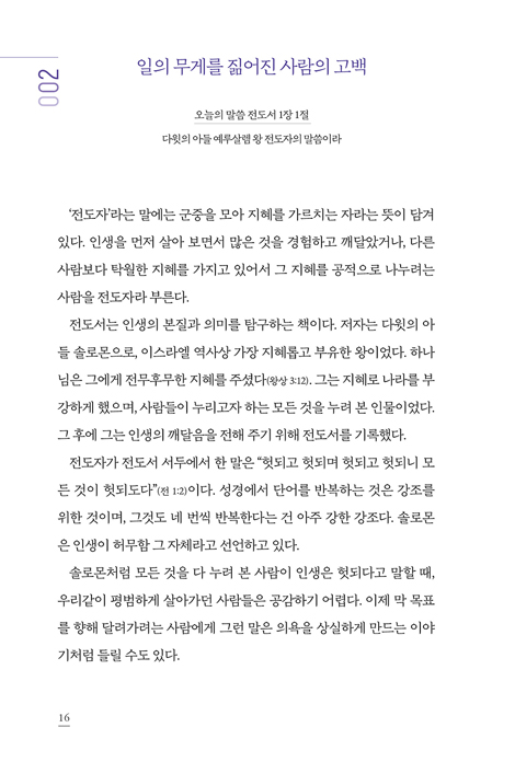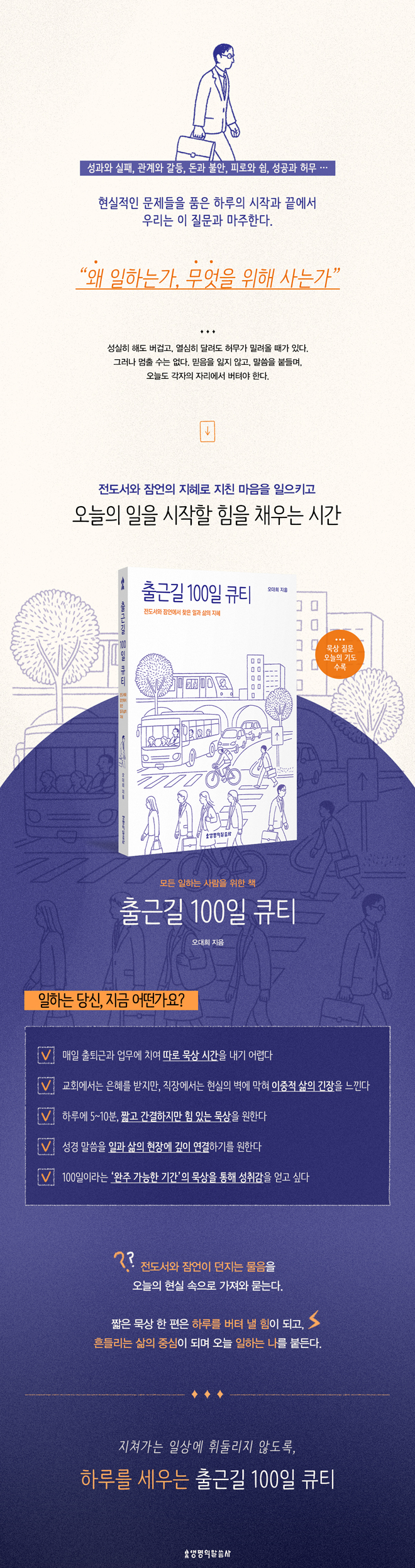 ¡¶Ãâ±Ù±æ 100ÀÏ Å¥Æ¼¡·´Â ÀÌ Áú¹® ¾Õ¿¡ ¼±, ¸ðµç ÀÏÇÏ´Â »ç¶÷À» À§ÇÑ Ã¥ÀÌ´Ù. Àüµµ¼¿Í Àá¾ðÀÌ ´øÁö´Â ±Ùº»ÀûÀÎ ¹°À½À» ¿À´ÃÀÇ Çö½Ç ¼ÓÀ¸·Î °¡Á®¿Í ¹¯´Â´Ù. ¡°¿Ö ÀÏÇϴ°¡, ¹«¾ùÀ» À§ÇØ »ç´Â°¡.¡± ºÎ¿Í ¸í¿¹, ¼ºÃë¿Í ±Ç·ÂÀ» ¸ðµÎ °æÇèÇÑ ¼Ö·Î¸óÀº °á±¹ °í¹éÇß´Ù. ÂüµÈ ÁöÇý´Â Çϳª´ÔÀ» °æ¿ÜÇÏ¸ç »ç´Â »î¿¡ ÀÖ´Ù°í. ÀÌ Ã¥Àº ±× °í¹éÀ» ¿À´ÃÀÇ µ¶ÀÚ¿¡°Ô À̾î ÁÖ¸ç, ¹Ù»Û ÀÏ»ó ¼Ó¿¡¼µµ ÇÏ·ç 10ºÐ, 100Àϰ£ÀÇ ¸»¾¸ ¾Õ¿¡ ¼µµ·Ï ÃÊ´ëÇÑ´Ù.