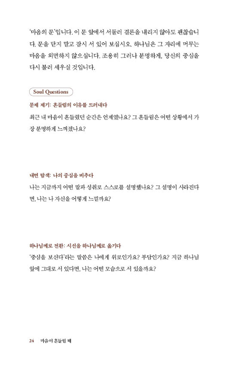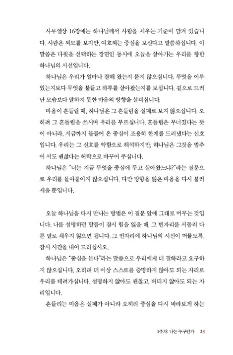 ¿¹¼ö´ÔÀº ÀÌ ±¸Á¶¸¦ ²÷¾î ³»½Ê´Ï´Ù. »ý¸íÀÇ °¡Ä¡´Â ¡®°¡Áø °Í¡¯¿¡¼­ ³ª¿ÀÁö ¾Ê´Â´Ù°í ºÐ¸íÈ÷ ¸»¾¸ÇϽʴϴÙ. ¿ì¸®ÀÇ °¡Ä¡´Â Çϳª´Ô°úÀÇ °ü°è¿¡¼­ ºñ·ÔµË´Ï´Ù. ´Ù½Ã ¸»ÇØ, ¿ì¸®ÀÇ °¡Ä¡ ¶§¹®¿¡ Çϳª´Ô²² ³ª¾Æ°¡´Â °ÍÀÌ ¾Æ´Ï¶ó, Çϳª´Ô²² ¼ÓÇØ ÀÖÀ½ ÀÚü·Î °¡Ä¡¸¦ Áõ¸íÇÕ´Ï´Ù. ÀÌ ÀüȯÀÌ ÀϾÁö ¾ÊÀ¸¸é, ¿ì¸®´Â Æò»ý °¡Ä¡¸¦ ÁÀ´Â »î¿¡¼­ ¹þ¾î³ª±â ¾î·Æ½À´Ï´Ù. ±×·¯³ª ÀÌ ÀüȯÀÌ ÀϾ´Â ¼ø°£, »îÀÇ ¹«°Ô´Â Á¶±Ý ´Þ¶óÁý´Ï´Ù. ´õ ÀÌ»ó ³ª¸¦ ÁöŰÁö ¸øÇÏ´Â ±âÁØÀ» ºÙÀâ°í ¹öƼÁö ¾Ê¾Æµµ µÇ±â ¶§¹®ÀÔ´Ï´Ù.