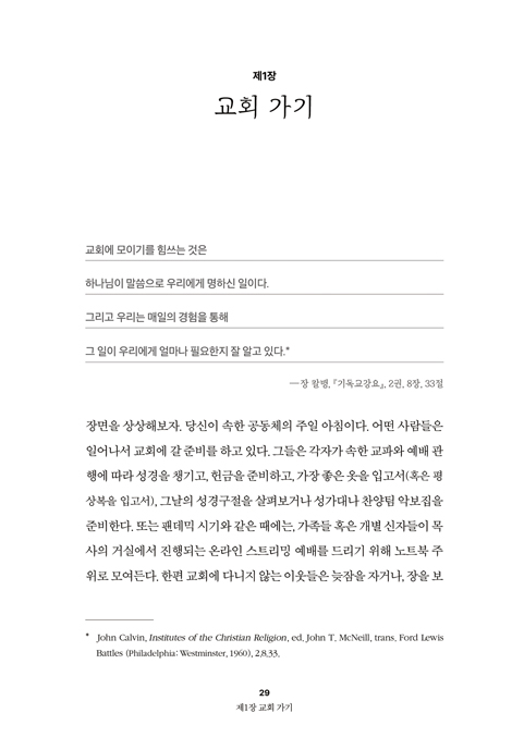ÀÌ Ã¥Àº ÃÑ 8ÀåÀ¸·Î ±¸¼ºµÇ¾î ÀÖ´Ù. ±³È¸ Ãâ¼®ÀÇ Àǹ«¿Í ½ÇÁ¦ »çÀÌÀÇ °£±ØÀ» ´Ù·é ¡°±³È¸ °¡±â¡±, ¿¹¹è °ø°£ÀÇ ¹èÄ¡¿Í Çൿ ¾ç½ÄÀ» ޱ¸ÇÏ´Â ¡°±³È¸¿¡¼¡±, ±×¸®°í ¼³±³¡¤±âµµ¡¤¼¼·Ê¡¤¼ºÂù µî ¿¹¹èÀÇ ÇÙ½É ¿ä¼ÒµéÀ» Â÷·Ê·Î »ìÆìº»´Ù. ³ª¾Æ°¡ ½Ã°¢ ¿¹¼ú°ú À½¾ÇÀÌ ¿¹¹è¿¡ ³¢Ä£ ¿µÇâ, ±×¸®°í °¡Á¤ ¿¹¹è¿Í °°Àº ¡®±³È¸ ¹ÛÀÇ ¿¹¹è¡¯±îÁö Æø³Ð°Ô Á¶¸íÇÑ´Ù.