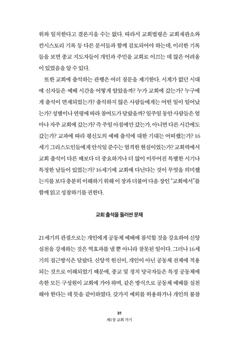 ÀÌ Ã¥Àº Á¾±³°³ÇõÀÚµéÀÇ ½ÅÇÐ ÀÌ·ÐÀ» ´Ü¼øÈ÷ ³ª¿ÇÏ´Â µ¥ ±×Ä¡Áö ¾Ê´Â´Ù. ´ë½Å 500³â Àü À¯·´ÀÇ Æò¹üÇÑ ±×¸®½ºµµÀεéÀÌ ÁÖÀÏ ¾ÆÄ§ ±³È¸·Î ÇâÇÏ´Â ±æ¿¡¼ºÎÅÍ ¿¹¹è´ç ¹®À» ¿°í µé¾î¿Í °æÇèÇß´ø ½Ã°¢Àû¡¤Ã»°¢Àû¡¤¿µÀû üÇè±îÁö¸¦ »ý»ýÇÏ°Ô º¹¿øÇÑ´Ù. ÀúÀÚ´Â °¡Å縯, ·çÅͱ³, °³Çõ±³È¸, ¼º°øÈ¸, ±×¸®°í Àç¼¼·ÊÆÄ¿¡ À̸£±â±îÁö 16¼¼±âÀÇ ÁÖ¿ä ´Ù¼¸ ½Å¾Ó ÀüÅëÀ» Æø³Ð°Ô ¾Æ¿ì¸£¸ç, ´ç½Ã ¿¹¹è ÇöÀåÀÇ ¸ð½ÀÀ» ÀÔüÀûÀ¸·Î Á¶¸íÇÑ´Ù.