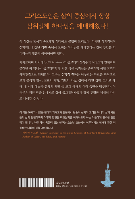¼¼°èÀûÀÎ Á¾±³°³Çõ ¿¬±¸ÀÚÀÌÀÚ ¹Ì±¹ Ä®ºó´ëÇб³ ¡®Ç¹ÌÅͼ¾ÅÍ¡¯ ¼ÒÀåÀÎ Ä¿¸° ¸·(Karin Maag) ±³¼ö°¡ ÁýÇÊÇÑ ¡ºÁ¾±³°³ÇõÀÚµé°ú ÇÔ²² µå¸®´Â ¿¹¹è¡»(Worshiping with the Reformers)´Â Á¾±³°³Çõ ½Ã´ë ¿¹¹èÀÇ ½ÇÁ¦ ¸ð½ÀÀ» »ý»ýÇÏ°Ô º¹¿øÇÑ ¿¬±¸¼ÀÌ´Ù. ÀÌ Ã¥Àº Á¾±³°³ÇõÀÌ ´Ü¼øÇÑ ±³¸® ³íÀïÀÌ ¾Æ´Ï¶ó ¿¹¹èÀÇ º»ÁúÀ» »õ·Ó°Ô ¼¼¿ì·Á´Â ¿îµ¿À̾úÀ½À», ´Ù¾çÇÑ ¿ª»ç ÀÚ·á¿Í Æò¹üÇÑ ½ÅÀÚµéÀÇ ¸ñ¼Ò¸®¸¦ ÅëÇØ ¼³µæ·Â ÀÖ°Ô º¸¿©ÁØ´Ù.