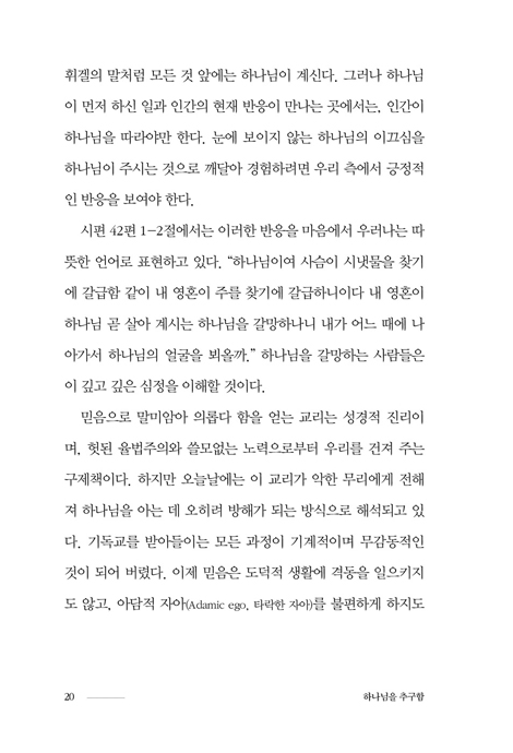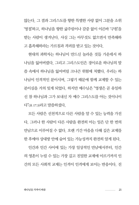 ÀÌ·± ½Ã´ë¿¡ ÅäÀú´Â Çϳª´ÔÀ» ÇâÇÑ °¥¸ÁÀÌ ½Å¾ÓÀÇ »Ñ¸®°¡ µÇ¾î¾ß ÇÔÀ» ´Ù½Ã±Ý Àϱú¿ì¸ç, º¹ÀâÇÔ ¼Ó¿¡¼­ ±æ ÀÒÀº ½Å¾ÓÀÌ º»±æÀ» ãµµ·Ï µ½´Â´Ù. ÁøÁ¤À¸·Î Çϳª´ÔÀ» Ãß±¸Çϱ⠿øÇÑ´Ù¸é ¸ÕÀú ±×ºÐÀ» ã°Ú´Ù´Â °á´ÜÀ» ÇÏ°í ¡®´Ü¼øÀÇ ±æ¡¯·Î ³ª¾Æ°¡¾ß ÇÑ´Ù. ¡ºÇϳª´ÔÀ» Ãß±¸ÇÔ¡»Àº ¹Ù·Î ÀÌ ±æÀ» °È°íÀÚ ÇÏ´Â À̵鿡°Ô °Å·èÇÑ °¥¸ÁÀ» ½ÇÇöÇÒ ÁöÇý¿Í ¿ë±â¸¦ ÁÙ °ÍÀÌ´Ù.