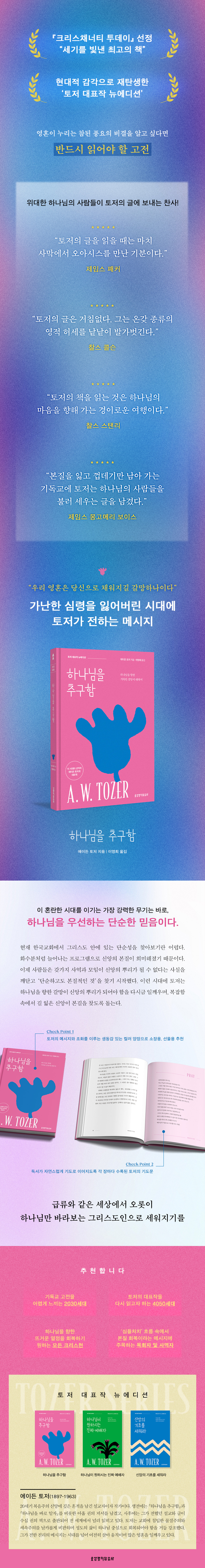 ¿¡À̵ç ÅäÀú´Â 20¼¼±â º¹À½ÁÖÀÇ ½Å¾Ó¿¡ ±íÀº ÈçÀûÀ» ³²±ä ¼³±³ÀÚÀÌÀÚ ÀÛ°¡ÀÌ´Ù. ±×´Â ¹Ì±¹ Ææ½Çº£À̴Ͼƿ¡¼­ ž û¼Ò³â±â¿¡ ȸ½ÉÇÑ ÈÄ, ²÷ÀÓ¾ø´Â ¼º°æ ¹¬»ó°ú ±âµµ·Î Çϳª´ÔÀ» Ãß±¸ÇÏ¸ç »ì¾Ò´Ù. 1919³âºÎÅÍ ±âµ¶±³¼±±³¿¬¸Í(Christian and Missionary Alliance)¿¡¼­ 44³â°£ ¸ñȸÇÏ¸ç ¸»¾¸À¸·Î ¼ö¸¹Àº ¼ºµµ¸¦ ¼¼¿ì´Â µ¥ Çå½ÅÇß´Ù. »ýÀü¿¡´Â ¡ºÇϳª´ÔÀ» Ãß±¸ÇÔ¡»°ú ¡ºÇϳª´ÔÀ» ¹Ù·Î ¾ËÀÚ¡»¸¦ ºñ·ÔÇÑ ¾ÆÈ© ±ÇÀÇ Àú¼­¸¦ ³²°å°í, »çÈÄ¿¡´Â ±×°¡ ÀüÇß´ø ¼³±³¿Í ±ÛÀÌ ¼ö½Ê ±ÇÀÇ Ã¥À¸·Î ÃâÆÇµÇ¾î Àü ¼¼°è¿¡¼­ ³Î¸® ÀÐÈ÷°í ÀÖ´Ù. ÅäÀú´Â ±³È¸¿¡ ħÀÔÇÑ ¹°ÁúÁÖÀÇ¿Í ¼¼¼ÓÁÖÀǸ¦ ³¯Ä«·Ó°Ô ºñÆÇÇÏ¸ç ¼ºµµÀÇ »îÀÌ Çϳª´Ô Áß½ÉÀ¸·Î ȸº¹µÇ¾î¾ß ÇÔÀ» °Åµì °­Á¶Çß´Ù. ±×´Â Æò»ý °æ°ÇÇÑ »îÀÇ ¸ð½ÀÀ¸·Î »ç¶÷µé¿¡°Ô º»º¸±â°¡ µÇ¾ú´Ù. ¡°Çϳª´ÔÀÇ »ç¶÷¡±À̶ó´Â ¹¦ºñ¸íÀÌ ±×ÀÇ »ý¾Ö¿Í »ç¿ªÀ» ¿ä¾àÇØ ÁØ´Ù. ±×°¡ ÀüÇÑ Áø¸®ÀÇ ¸Þ½ÃÁö´Â ½Ã´ë¸¦ ³Ñ¾î ¿©ÀüÈ÷ »ì¾Æ ¿òÁ÷ÀÌ¸ç ¸¹Àº ¿µÈ¥À» Àϱú¿ì°í ÀÖ´Ù.