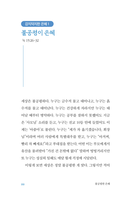 ¡®ºÒ°øÆòÇÑ ÀºÇý¡¯¶ó´Â Á¦¸ñÀº Àΰ£ÀÇ À̼º°ú ÀÌÇØ¸¦ ³Ñ¾î¼´Â Çϳª´Ô »ç¶ûÀÇ ½Åºñ¸¦ º¸¿©ÁÝ´Ï´Ù. ±× º¹À½ÀÇ Áø¸®°¡ ¹®À帶´Ù ¿Â±â¿Í ±íÀ̸¦ ´õÇÕ´Ï´Ù. Ã¥ÀåÀ» ³Ñ±â´Ù º¸¸é µ¶ÀÚ´Â ´Ù½Ã ÀϾ ÈûÀ» ¾ò½À´Ï´Ù. »îÀÇ ¾î¶² ¼ø°£µµ Çϳª´ÔÀÇ ÀºÇý°¡ ¿ª»çÇϽô ÀÚ¸®ÀÓÀ» »õ·Ó°Ô ¹Ù¶óº¸±â ¶§¹®ÀÔ´Ï´Ù. ¡°¹Ù´Ù´Â ³·¾Æ¼ ¸ðµç ¹°À» ¹Þ¾ÆµéÀδ١±¶ó´Â °í¹éó·³ ÀÚ½ÅÀ» ³·Ãâ ¶§ ´õ ±í¾îÁö´Â ÀºÇýÀÇ ¼¼°è¸¦ ¸¸³ª°Ô µË´Ï´Ù. ¡¶ºÒ°øÆòÇÑ ÀºÇý¡·´Â ¾Õ¸¸ º¸¸ç ´Þ·Á¿Â 21¼¼±â ¼ºµµµé¿¡°Ô, ÀÌ¹Ì ¿ì¸® ¾È¿¡ ºÎ¾îÁֽŠÇϳª´ÔÀÇ »ç¶ûÀ» ´Ù½Ã Àϱú¿ì´Â ¹ÏÀ½ÀÇ ½°ÅͰ¡ µÉ °ÍÀÔ´Ï´Ù.