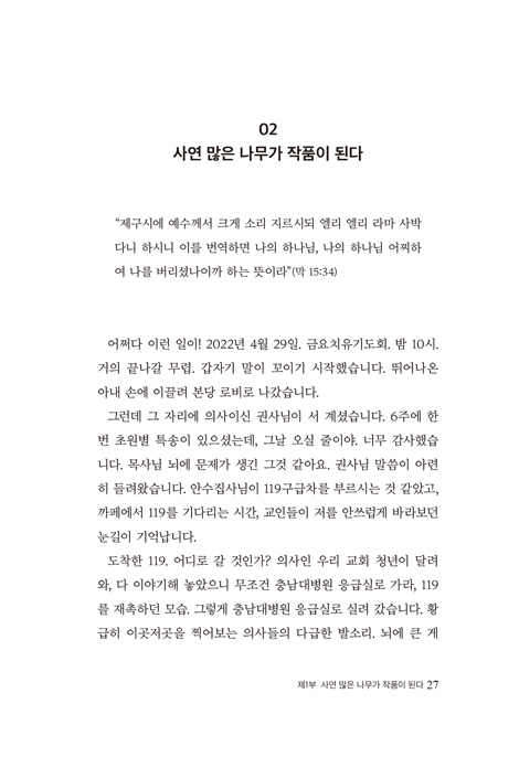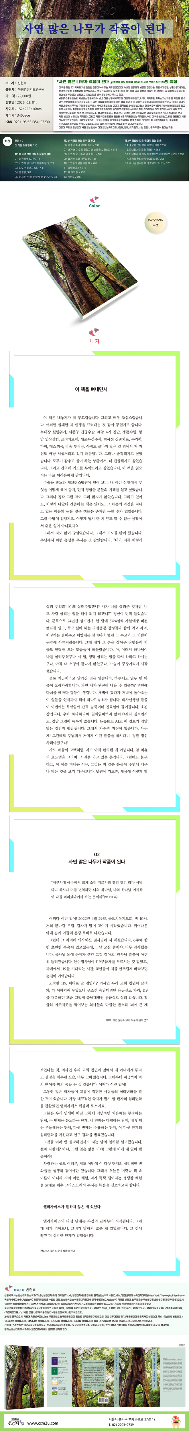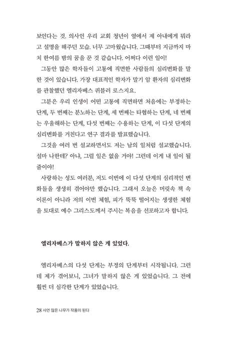 ÀÌ Ã¥À» Æì³»¸é¼ / 10 Á¦1ºÎ »ç¿¬ ¸¹Àº ³ª¹«°¡ ÀÛǰÀÌ µÈ´Ù 01. õ±¹¿¡¼ 6½Ã°£ / 14 02. »ç¿¬ ¸¹Àº ³ª¹«°¡ ÀÛǰÀÌ µÈ´Ù / 27 03. ³ªµµ À§·Î¹Þ°í ½Í´Ù! / 41 04. ²¬²¬²¬ / 64 05. ÀÌÁ¦ ³²Àº »î, ¾î¶»°Ô »ì °ÍÀΰ¡? / 83 Á¦2ºÎ ¿ª°æÀº Èʳ¯ °æ·ÂÀÌ µÈ´Ù 06. ¿ª°æÀº Èʳ¯ °æ·ÂÀÌ µÈ´Ù / 134 07. ³»°¡ ³× ±âµµ¸¦ µé¾ú°í ³× ´«¹°À» º¸¾Ò³ë¶ó / 148 08. ³ªÀÇ ¹ßÀ» »ç½¿°ú °°°Ô ÇÏ»ç / 169 09. ¶§°¡ À̸£¸Å °ÅµÎ¸®¶ó / 185 10. °ÅÀεéÀÌ ¾ÕÀ» ¸·À» ¶§ / 203 11. ¿¡µ¨¹ÙÀ̽º / 216 12. ¼¼ °³ÀÇ ¸ø / 230 13. ³ò¹ì / 244 Á¦3ºÎ Áß¿äÇÑ °ÍÀº ²ªÀÌÁö ¾Ê´Â ¸¶À½ 14. Áß¿äÇÑ °ÍÀº ²ªÀÌÁö ¾Ê´Â ¸¶À½ / 256 15. ´Ù´Ï¿¤Ã³·³ ¶æÀ» Á¤ÇÏ¿© / 268 16. ´ÙÀó·³ ³» ¸¶À½ÀÌ È®Á¤µÇ¾ú°í È®Á¤µÇ¾ú»ç¿À´Ï / 290 17. ¿éó·³ ¿ø¸ÁÇÏÁö ¾Æ´ÏÇϴ϶ó / 306 18. Çϳª´Ô »ý°¢Àº ³» »ý°¢º¸´Ù Å©½Ã´Ù / 325 Ã¥ ¼ÓÀ¸·Î