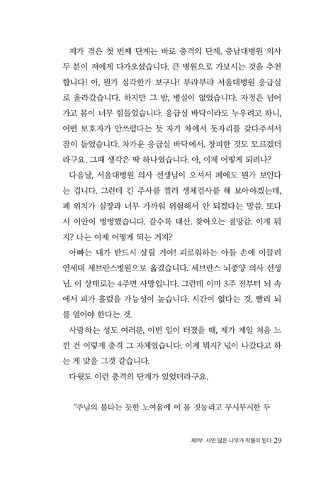 ÀÌ Ã¥Àº Æó¾Ï 4±â ¸ñ»çÀÇ °¡½¿ ÀýÀýÇÑ °£ÁõÀÌ ³ì¾Æ ÀÖ´Â Ä¡À¯³»¿ëÀÌ´Ù. ³ì³»Àå ½Ç¸íÀ§±â, ³úÁ¾¾ç ±ä±Þ¼ö¼ú, Æó¾Ï 4±â Áø´Ü, »ýÁ¸¼ö¸í 38°³¿ù, Ç×¾Ï ÀÓ»ó½ÇÇè, Ç¥ÀûÄ¡·áÁ¦, ¼¼Æ÷µ¶¼ºÁÖ»ç, ¹æ»ç¼± ÁýÁßÄ¡·á, ¹«±â·Â, ¸¶ºñ, ¸Þ½º²¨¿ò, °¢Á¾ ºÎÀÛ¿ë, ¾ÆÁ÷µµ ³¡³ªÁö ¾ÊÀº ±æ À§¿¡¼ ÀúÀÚ ÀÚ½ÅÀÌ °Þ°í ÀÖ´Â µÎ·Á¿ò°ú ½½Çİú ±× Ä¡À¯°úÁ¤À» ¸Å¿ì Áø¼ÖÇÏ°Ô ±â·ÏÇϰí ÀÖ´Ù. ³úÁ¾¾ç ¼ö¼úÀ» ¹Þ´À¶ó ¼¼ºê¶õ½º º´¿ø¿¡ ÀÔ¿øÇØ º¸´Ï, ÀÌ·± »óȲ¿¡¼ ¹«¾ùÀ» ¾î¶»°Ô ÇØ¾ß ÇÒÁö, ³Ê¹«³ª ¸·¸·Çß´ø ÀúÀÚ´Â ÀÚ½Åó·³ ÇÑ Ä¡ ¾Õµµ ¾Ë ¼ö ¾ø´Â »óȲ¿¡¼ ¾ÆÇÄÀÇ °úÁ¤À» Áö³ª°í ÀÖ´Â ºÐµéÀ» À§ÇÏ¿© ´«¹° Á¥Àº Ã¥À» Æì³Â´Ù. ÀÌ Ã¥¿¡´Â ÀúÀÚ°¡ ¼ö¼ú´ë¿¡¼ üÇèÇÑ Ãµ±¹ À̾߱â, Á¦ÁÖµµ »ç·Á´Ï ½£¿¡¼ ¸ñ°ÝÇÑ ±¸¸Û ¶Õ¸° ³ª¹«¿¡¼ »õ½ÏÀÌ µ¸°í ÀÖ´Â À̾߱â, ±º¸ñÀ¸·Î 24³â°£ ¼¶±â¸é¼ ÇÑ ´Þ¿¡ 3¹Ú4ÀϾ¿ Àڻ쿹¹æ ºñÀüÄ·ÇÁ¸¦ ¿°í Á×°í ½Í¾î ÇÏ´Â ÀÚ»ìÃæµ¿ À庴µé°ú ÇÔ²² ¸Ô°í ÀÚ¸ç ¹«¾ùÀÌµç µé¾îÁÖ°í ¾î¶»°Ôµç »ì·Á³»·Á Çß´ø ½ÇÁ¦ À̾߱âµéÀÌ °ÅÁþ ¾øÀÌ Áø½ÇÇÏ°Ô ½Ç·Á ÀÖ´Ù. ÀúÀÚ´Â ¾ÕÀ¸·Î ³²Àº ½Ã°£, ÇÑ »ý¸íÀÌ¶óµµ ´õ »ì¸®´Â ÀÏÀ» ÇÏ°í ½Í¾î ÇÑ´Ù. ÀÌ Ã¥ÀÌ ±×·± »ý¸í »ì¸®´Â ÀÏ¿¡ ºÎÁ·ÇÏÁö¸¸ ±ÍÇÏ°Ô ¾²¿´À¸¸é ÇÑ´Ù. Áö±Ý º´»ó¿¡ ´©¿ö ÀÖ´Â µ¶ÀÚµéÀÌ, ±×¸®°í Áö±Ý ¿ª°æÀÇ ÆÄµµ¿¡ ÈÛ¾µ·Á Çã¿ìÀû°Å¸®°í ÀÖ´Â µ¶ÀÚµéÀÌ, ºÎµð ÀÌ Ã¥À» ¹Þ¾Æº¸°í, ¸ÚÁø ÆÄµµÅ¸±â ¼ÇÎ ¼±¼ö°¡ µÇ¾úÀ¸¸é ÇÏ´Â ¹Ù¶÷ÀÌ ´ã°Ü ÀÖ´Ù. ÀúÀÚ´Â Àλý±æ °¡´Ù°¡ ¾ÆÇÄÀÇ ±¸¸ÛÀÌ »½ ¶Õ¸° µ¶ÀÚ ¿©·¯ºÐµµ, Àú »õ½ÏÀÌ µ¸¾Æ³ª´Â ³ª¹«Ã³·³, ´©±º°¡¿¡°Õ Èñ¸ÁÀÌ µÉ ¼ö ÀÖ´Ù°í ¸»ÇÑ´Ù. »óó ÀÔÀº Ä¡À¯Àڷμ, °£ÁõÀÌ µÉ ¼ö ÀÖ´Ù°í À§·ÎÇÑ´Ù. ±×·¸´Ù! ¿ì¸®³× Àλý»ìÀÌ, »ç¿¬ ¾ø´Â ÀλýÀÌ ¾îµð Àְڴ°¡? ±×·¯³ª Àý´ë, Àý´ë, ÀØÁö ¸»ÀÚ. »ç¿¬ ¸¹Àº ³ª¹«°¡ ÀÛǰÀÌ µÈ´Ù´Â °ÍÀ»! ÀúÀÚ ¹× ¿ªÀÚ ¼Ò°³