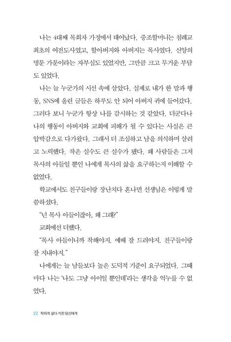 ¸¹Àº Å©¸®½ºÃµÀÌ Á¾Á¾ ¡®ÂøÇÏ°Ô »ì¾Æ¾ß Çϳª´Ô²² »ç¶û¹ÞÀ» ¼ö ÀÖ´Ù¡¯´Â ¹«ÀǽÄÀûÀÎ °­¹Ú¿¡ ½Ã´Þ¸°´Ù. ¡®ÂøÇÑ ±×¸®½ºµµÀΡ¯À¸·Î »ì±â À§ÇØ ¾Ö¸¦ ¾µ¼ö·Ï ¿ì¸® ¸¶À½¿£ Àǹ«°¨¸¸ ³²Àº ä Á¡Á¡ ¸Þ¸»¶ó°£´Ù. ¸ñȸÀÚÀÇ ¾Æµé·Î ÀÚ¶ó¸ç ¡®¸ñ»ç ¾ÆµéÀÌ´Ï ÂøÇØ¾ß ÇÑ´Ù¡¯´Â ÁÖº¯ÀÇ ½Ã¼± ¼Ó¿¡¼­ ÁöÃݬ´ø ÀúÀÚÀÇ ¼ÖÁ÷ÇÑ °í¹éÀº, ¡®ÂøÇÏ°Ô »ì´Ù ÁöÄ£¡¯ ¼ö¸¹Àº Å©¸®½ºÃµµé¿¡°Ô ±íÀº °ø°¨À» ²ø¾î³½´Ù. ±íÀº ¹ã ´«¹°ÀÇ ±âµµ ¼Ó¿¡¼­ Çϳª´ÔÀÇ ±íÀº »ç¶ûÀ» ¸¸³­ ÈÄ¿¡¾ß ÀúÀÚ´Â ÀÚ½ÅÀÌ ¡°ÁøÂ¥ »ç¶ûÀ» ÇÒ ¼ö ÀÖ´Â »ç¶÷ÀÌ µÇ¾ú´Ù¡±¶ó°í °í¹éÇÑ´Ù. ±×¸®°í ±× »ç¶ûÀ» Èê·Áº¸³»°í ½Í´Ù´Â ¿­¸ÁÀÌ ±×¸¦ Çѱ¹ÄÄÆÐ¼Ç »ç¿ªÀ¸·Î À̲ø¾ú´Ù.