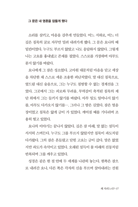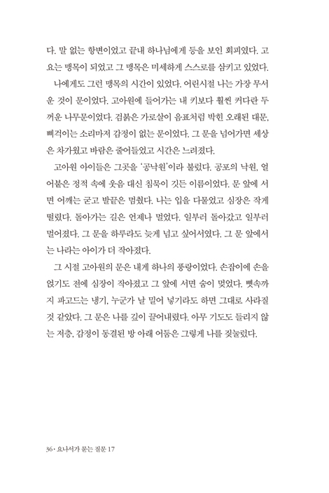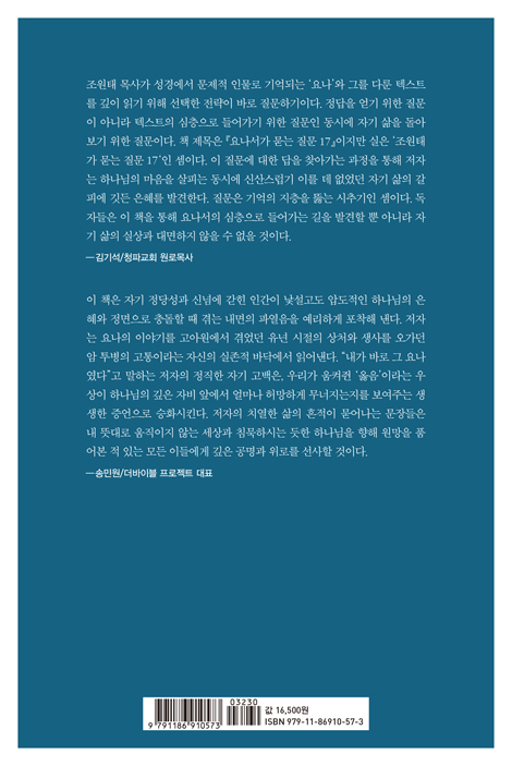 ÀÌ Ã¥Àº ÀÚ±â Á¤´ç¼º°ú ½Å³ä¿¡ °¤Èù Àΰ£ÀÌ ³¸¼³°íµµ ¾ÐµµÀûÀÎ Çϳª´ÔÀÇ ÀºÇý¿Í Á¤¸éÀ¸·Î Ãæµ¹ÇÒ ¶§ °Þ´Â ³»¸éÀÇ ÆÄ¿À½À» ¿¹¸®ÇÏ°Ô Æ÷ÂøÇØ ³½´Ù. ÀúÀÚ´Â ¿ä³ªÀÇ À̾߱⸦ °í¾Æ¿ø¿¡¼ °Þ¾ú´ø À¯³â ½ÃÀýÀÇ »óó¿Í »ý»ç¸¦ ¿À°¡´ø ¾Ï Åõº´ÀÇ °íÅëÀ̶ó´Â ÀÚ½ÅÀÇ ½ÇÁ¸Àû ¹Ù´Ú¿¡¼ Àо´Ù. ¡°³»°¡ ¹Ù·Î ±× ¿ä³ª¿´´Ù¡±°í ¸»ÇÏ´Â ÀúÀÚÀÇ Á¤Á÷ÇÑ Àڱ⠰í¹éÀº, ¿ì¸®°¡ ¿òÄÑÁå ¡®¿ÇÀ½¡¯À̶ó´Â ¿ì»óÀÌ Çϳª´ÔÀÇ ±íÀº ÀÚºñ ¾Õ¿¡¼ ¾ó¸¶³ª Çã¸ÁÇÏ°Ô ¹«³ÊÁö´ÂÁö¸¦ º¸¿©ÁÖ´Â »ý»ýÇÑ Áõ¾ðÀ¸·Î ½ÂȽÃŲ´Ù. ÀúÀÚÀÇ Ä¡¿ÇÑ »îÀÇ ÈçÀûÀÌ ¹¯¾î³ª´Â ¹®ÀåµéÀº ³» ¶æ´ë·Î ¿òÁ÷ÀÌÁö ¾Ê´Â ¼¼»ó°ú ħ¹¬ÇϽô µíÇÑ Çϳª´ÔÀ» ÇâÇØ ¿ø¸ÁÀ» ǰ¾îº» Àû ÀÖ´Â ¸ðµç À̵鿡°Ô ±íÀº °ø¸í°ú À§·Î¸¦ ¼±»çÇÒ °ÍÀÌ´Ù.