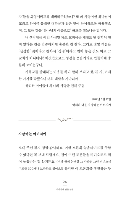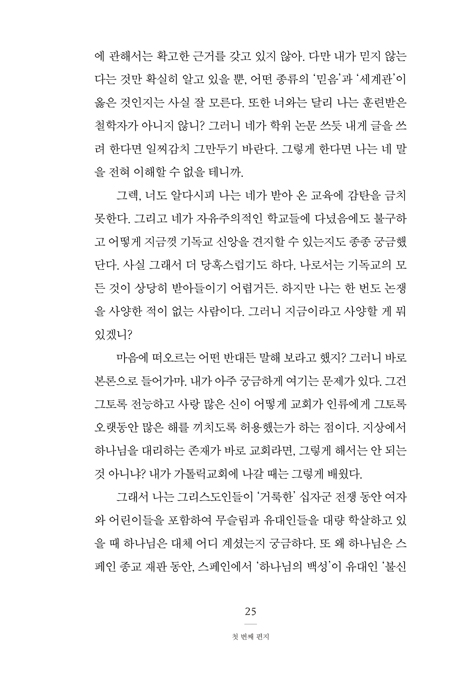 ±×·¹°í¸®¿Í ±×ÀÇ ¾Æ¹öÁö°¡ ÁÖ°í¹ÞÀº ¼½ÅÀº ±× ÀÚü·Î ¸Å¿ì Èï¹ÌÁøÁøÇÏ´Ù. ¹«¾ùº¸´Ù ±âµ¶±³¿¡ ´ëÇÑ ¾Æ¹öÁöÀÇ ³¯Ä«·Î¿î Áú¹®µé¿¡ ´ëÇÑ ÀúÀÚÀÇ ´äº¯Àº, ³»°¡ Áö±Ý±îÁö Àо °Í Áß °¡Àå ºÐº°·Â ÀÖ°í ¼º°æÀûÀ̸ç À̼ºÀûÀÌ´Ù. ¸¸¾à ³»°¡ ¹Ì±¹ÀÇ ¸ðµç û³â¿¡°Ô ÀÌ Ã¥À» Çʵ¶¼·Î ÁöÁ¤ÇÒ ¼ö ÀÖ´Ù¸é ±â²¨ÀÌ ±×·¸°Ô ÇÒ °ÍÀÌ´Ù. ±×·¸°Ô µÈ´Ù¸é, ±âµ¶±³°¡ »îÀÇ ±Ù¿øÀûÀÎ Áú¹®µé¿¡ ´ëÇØ ÁöÀûÀ¸·Î ¸¸Á·½º·¯¿î ÇØ´äÀ» Á¦½ÃÇÑ´Ù´Â »õ·Î¿î ÀνÄÀ» ½É¾îÁÙ ¼ö ÀÖÀ» °ÍÀÌ´Ù.