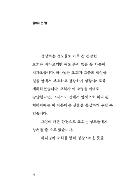 ±×¸®½ºµµÀÎÀº ¸Å¿ì ½ÇÁ¦ÀûÀÎ Áú¹®À¸·Î °í½ÉÇÑ´Ù. ¼º°æÀÌ ±ÇÇÏ´Â ±³È¸ °øµ¿Ã¼´Â ¾î¶² ¸ð½ÀÀ̰í, ÀÌ»óÀûÀÎ ¿¹¹è´Â ¾î¶² ÇüŸ¦ ÃëÇØ¾ß Çϴ°¡? ¼º°æÀûÀÎ »ç¿ªÀº ¹«¾ùÀ̰í, ¼º°æÀÌ Á¤ÀÇÇÏ´Â ¸®´õ½ÊÀº ¹«¾ùÀΰ¡? ÀÌ·± Áú¹®Àº 9Marks ¼±±³È¸ÀÇ ¡®±³È¸ Áú¹®¡¯ ½Ã¸®Áî°¡ ¸íÈ®ÇÏ°íµµ ½ÅÁßÇÑ ´äº¯À» Á¦½ÃÇÏ´Â ¿©·¯ Áú¹®ÀÇ ÀϺÎÀÏ »ÓÀÌ´Ù. ÀÌ »ç¿ªÀÌ ½Å½ÇÇÑ ±³È¸¿¡¼ ³î¶øµµ·Ï °Ç°ÇÏ°í ±àÁ¤ÀûÀÎ ¿µÇâÀ» ¹ÌÄ¡°í ÀÖ´Ù´Â »ç½Ç¿¡ ÂüÀ¸·Î °¨»çÇÏ´Ù. ÀÌ Ã¥À» Àû±Ø ÃßõÇÑ´Ù.