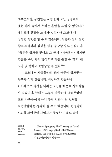 ÀúÀÚ´Â ±³È¸¿¡¼ °ÞÀ» ¼ö¹Û¿¡ ¾ø´Â °¥µî¿¡ ¾î¶»°Ô ´ëºñÇØ¾ß ÇÒÁö, °¨Á¤ÀÌ »óÇßÀ» ¶§ ¾î¶»°Ô ´ëÃ³ÇØ¾ß ÇÒÁö, »óó ÀÔÀº ¸¶À½À» ¾î¶»°Ô ȸº¹ÇØ¾ß ÇÒÁö¿¡ ´ëÇØ ½ÇÁúÀûÀÌ°íµµ ¼º°æÀûÀÎ ¹æ¹ýÀ» Á¦½ÃÇÑ´Ù. ±×´Â °ü°èÀÇ ¿ì¼±¼øÀ§°¡ ¾ðÁ¦³ª ±×¸®½ºµµÀÇ ¿µ±¤ÀÓÀ» ±â¾ïÇϰí, Ÿ¶ôÇÑ ¼¼»ó¿¡¼ »óó¹Þ´Â ÀÏÀº ºÒ°¡ÇÇÇÏ´Ù´Â »ç½ÇÀ» ÀÎÁ¤Çϸç, ºÐ³ëÀÇ ¿øÀÎÀÌ Àڱ⠸¶À½¼ÓÀÇ ¿ì»ó¿¡¼ ºñ·ÔµÈ °ÍÀº ¾Æ´ÑÁö È®ÀÎÇØº¸¶ó°í Á¶¾ðÇØÁÖ¸ç, »óó¹Þ±â Àü°ú ÈÄ ±×¸®°í °¨Á¤ÀÌ »óÇÑ Á÷ÈÄ¿¡ ÁöÇý·Ó°Ô ¹ÝÀÀÇÏ°í ´ëóÇÏ´Â ¹æ¹ýÀ» ¾Ë·ÁÁØ´Ù.