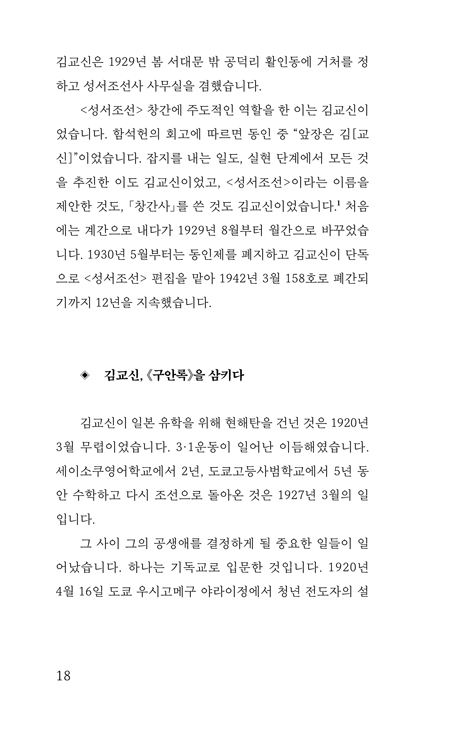 ÀÌ ¸»Àº Ã¥»ó¹°¸²ÀÇ ³¶¸¸Àû ¿Á¤¿¡ ±×Ä¡Áö ¾Ê¾Ò½À´Ï´Ù. ÀÌÈÄ ±è±³½ÅÀº ¡®¼º¼¡¯¿Í ¡®Á¶¼±¡¯¿¡ »î ÀüºÎ¸¦ ½ñ¾ÆºÎ¾ú½À´Ï´Ù. ±è±³½ÅÀº ´Üµ¶À¸·Î ÆíÁýÀ» ¸ÃÀº 1930³â 5¿ù ÀÌÈÄ 12³â°£ <¼º¼Á¶¼±>À» °£ÇàÇϱâ À§ÇØ ¸Å´Þ ÁýÇʰú ÆíÁý, ±³Á¤, ¼Á¡ ¹è´Þ°ú ¿ìÆí ¹ß¼ÛÀ» È¥ÀÚ¼ ÇØ³Â½À´Ï´Ù. ÇÑ ´Þ¿¡µµ ¸î ¹ø¾¿ ÁýÇÊÀ» À§ÇØ ¹ãÀ» »õ¿ö¾ß Çß°í, ¸Å´Þ Ãѵ¶ºÎ¿Í Àμâ¼Ò¿Í ¼Á¡À» ¿À°¡¸ç ¾öû³ ±¼¿åÀ» °¨³»ÇØ¾ß Çß½À´Ï´Ù. ¸Å´Þ ¹ß»ýÇÏ´Â °á¼ÕÀ» ÀÚ½ÅÀÇ ±³»ç ¿ù±ÞÀ¸·Î ¸Þ²Ù¾î¾ß Çß½À´Ï´Ù. <¼º¼Á¶¼±> µ¶ÀÚ´Â 200¸í ³»¿Ü¿´°í, ÇÑ ±Ç¿¡ 15Àü, ¹Ý³â ±¸µ¶·á°¡ 90ÀüÀ̾ú½À´Ï´Ù. ±¸µ¶·á·Î´Â ¿ìÆí ¹ß¼Û ºñ¿ëÀ» °Ü¿ì ´î ¼ö ÀÖ´Â Á¤µµ¿´½À´Ï´Ù. ±¸µ¶·á¸¦ ¹Þ¾Æ ÀâÁö¸¦ ³»´Â °ÍÀº ¿¹¼ö À縲 ¶§³ª °¡´ÉÇÒ °Å¶ó°í ¸»Çϱ⵵ Çß½À´Ï´Ù. »ç¶ûÇÏ´Â ¡®Á¶¼±¡¯¿¡ °¡Àå ±ÍÇÑ ¡®¼º¼¡¯¸¦ ÁÖ°Ú³ë¶ó°í Çß´ø ¡¸Ã¢°£»ç¡¹´Â ±è±³½ÅÀÇ »ç¸í ¼±¾ðÀ̾ú´ø ¼ÀÀÔ´Ï´Ù. Çϳª´ÔÀ¸·ÎºÎÅÍ ¾î¶² ÀÏÀ» Çϵµ·Ï ºÎ¸§À» ¹Þ´Â´Ù´Â °ÍÀº ÀÌó·³ Çϳª´Ô ¾Õ¿¡¼, ±×¸®°í ¿ª»ç ¾Õ¿¡¼ ÀÚ½ÅÀÌ ¸ö´ãÀº °øµ¿Ã¼ÀÇ ¸ð¼øµÈ ÀÚ¸®¸¦ ¹ß°ßÇϰí, °Å±â¿¡¼ºÎÅÍ ÀÚ½ÅÀÇ ±æÀ» ã¾Æ°¡´Â ÀÏÀÏ °ÍÀÔ´Ï´Ù. _36~37ÂÊ
