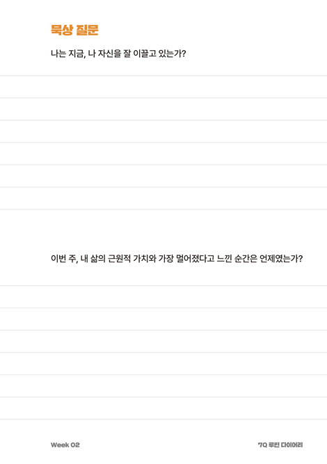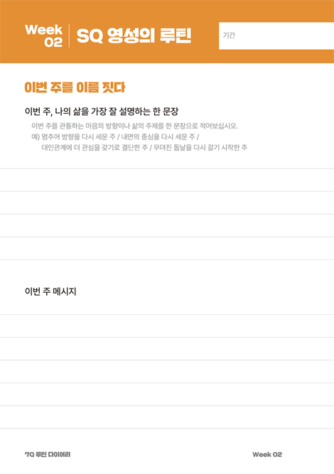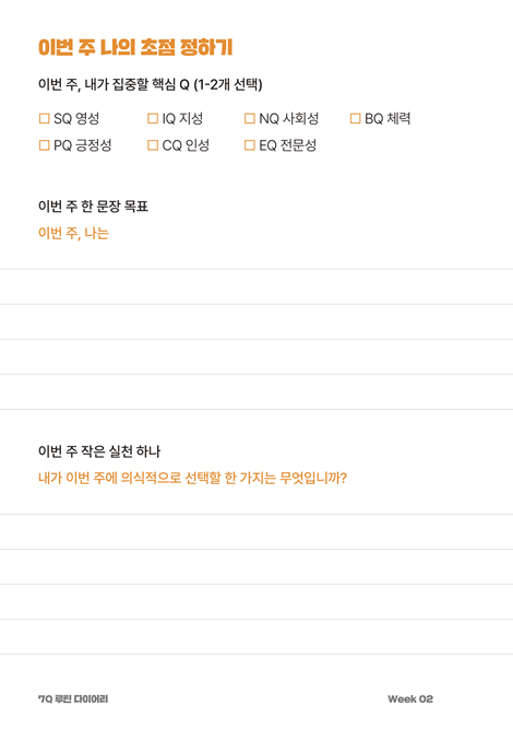 Ȱ¿ë: °³ÀÎ ¹¬»ó / ¼Ò±×·ì / ¸®´õ½Ê ÈÆ·Ã / ÄÚĪ ¡º7Q ·çƾ ´ÙÀ̾¡» ¡°±â·ÏÀÌ ¾Æ´Ï¶ó, ¹æÇâÀ» ¾²´Â ´ÙÀ̾¡± ºÎÁ¦: ¼¿ÇÁ ¸®´õ½ÊÀÇ Å鳯À» °¥¾Æ³»´Â 12ÁÖ ·çƾ ¡á ´õ ¸¹ÀÌ ¾²±âº¸´Ù, ´õ Á¤Á÷ÇÏ°Ô µ¹¾Æº¸´Â ½Ã°£ ¿À´Ã ¿ì¸®´Â ³Ê¹« ¸¹Àº °ÍÀ» ±â·ÏÇÕ´Ï´Ù. ÇÏÁö¸¸ Á¤ÀÛ ¾îµð·Î °¡°í ÀÖ´ÂÁö´Â Á¡°ËÇÏÁö ¾ÊÀº ä, ÇϷ縦 ¹Ýº¹ÇÕ´Ï´Ù. ¡º7Q ·çƾ ´ÙÀ̾¡»´Â ¡°ÀßÇߴ°¡?¡±¸¦ ¹¯Áö ¾Ê½À´Ï´Ù. ´ë½Å ÀÌ·¸°Ô ¹¯½À´Ï´Ù. ¡°³ª´Â Áö±Ý, ³ª ÀÚ½ÅÀ» Àß À̲ø°í Àִ°¡?¡± ÀÌ ´ÙÀ̾´Â ¼º°ú °ü¸® ³ëÆ®°¡ ¾Æ´Ï¶ó, »îÀÇ ¹æÇâÀ» ´Ù½Ã ¼¼¿ì´Â ÈÆ·Ã µµ±¸ÀÔ´Ï´Ù. ¡á ¡®¸ÅÀÏ¡¯ÀÌ ¾Æ´Ï¶ó ¡®ÁÖ°£¡¯ÀÎ ÀÌÀ¯ ÀÌ ·çƾºÏÀº ¸ÅÀÏ Á¡°ËÇÏÁö ¾Ê½À´Ï´Ù. ÇÑ ÁÖ¿¡ ÇÑ ¹ø, 7Q Àüü¸¦ µ¹¾Æº¸°í ÇÑ ÁÖ µ¿¾È ´Ü ÇϳªÀÇ ÇÙ½É Q¸¦ »ì¾Æ³»´Â ±¸Á¶ÀÔ´Ï´Ù. ¡°ÀßÇÑ ÁÖº¸´Ù µ¹¾Æº» ÁÖ°¡ Áß¿äÇϰí, ¸¹ÀÌ ¾´ ±â·Ïº¸´Ù Á¤Á÷ÇÑ ÇÑ ¹®ÀåÀÌ ´õ Áß¿äÇÕ´Ï´Ù.¡± (p.6) ¿Ïº®ÀÌ ¸ñÇ¥°¡ ¾Æ´Ï¶ó, Áö¼ÓÀÌ ¸ñÇ¥ÀÔ´Ï´Ù. ¡á 7Q: »îÀ» ÀüÀÎÀûÀ¸·Î Á¡°ËÇÏ´Â ³ªÄ§¹Ý 7Q´Â Àϰö °ú¸ñÀÌ ¾Æ´Ï¶ó ÇϳªÀÇ ³ªÄ§¹ÝÀÔ´Ï´Ù. SQ ¿µ¼º – »îÀÇ ÀÇ¹Ì¿Í ¸ñÀû PQ ±àÁ¤¼º – ¹ÏÀ½À» ¼±ÅÃÇϴ ŵµ IQ Áö¼º – ¹¯°í ¹è¿ì¸ç »ý°¢ÇÏ´Â Èû CQ Àμº – ¸»°ú ŵµ¿¡ µå·¯³ª´Â ¼ºÇ° NQ »çȸ¼º – °øµ¿Ã¼¸¦ »ì¸®´Â °ü°è EQ Àü¹®¼º – »ç¸íÀ» °¨´çÇÒ ½Ç·Â BQ ü·Â – ÁöÄ¡Áö ¾Ê°Ô ÁöÅÊÇÏ´Â ¿¡³ÊÁö »îÀÇ ÇÑ ¿µ¿ªÀÌ ¹«³ÊÁö¸é ´Ù¸¥ ¿µ¿ªµµ ÇÔ²² Èçµé¸³´Ï´Ù. ±×·¡¼ ¸®´õ½ÊÀº ºÎºÐÀÌ ¾Æ´Ï¶ó ±ÕÇüÀÇ ¹®Á¦ÀÔ´Ï´Ù. ¡á 12ÁÖ, »îÀ» ´Ù½Ã ¹Ù¶óº¸´Â ¿©Á¤ ÀÌ ´ÙÀ̾´Â 12ÁÖ ÁÖ°£ ·çƾÀ¸·Î ±¸¼ºµË´Ï´Ù. Part 1: ¸ØÃß¾î ¹æÇâÀ» Á¡°Ë Part 2: ÇÑ ÁÖ¿¡ ÇÑ ¹ø 7Q Á¡°Ë Part 3: ´Ù½Ã, »îÀ¸·Î ¸ÅÁÖ ´ÙÀ½ Áú¹®À¸·Î ½ÃÀÛÇÕ´Ï´Ù. ¡°À̹ø ÁÖ, ³» »î¿¡¼ °¡Àå ¹«µ®Á³´Ù°í ´À³¤ Å鳯Àº ¹«¾ùÀ̾ú´Â°¡?¡± (Week 01) ±×¸®°í ¸ÅÁÖ µ¿ÀÏÇÑ ±¸Á¶·Î Á¤·ÄÇÕ´Ï´Ù. À̹ø ÁÖ À̸§ Áþ±â ÇÙ½É Q ¼±Åà ÀÛÀº ½Çõ 7Q ÁÖ°£ È帧 üũ ªÀº ±âµµ ¡á ÀÌ ´ÙÀ̾°¡ µ¶ÀÚ¿¡°Ô ³²±â´Â ¸Þ½ÃÁö ¡°¸®´õ½ÊÀº »õ·Î¿î °ÍÀ» ´õÇÏ´Â °ÍÀÌ ¾Æ´Ï¶ó, Èçµé¸± ¶§¸¶´Ù ´Ù½Ã µ¹¾Æ¿Ã ¹æÇâÀ» ±â¾ïÇÏ´Â ÈûÀÔ´Ï´Ù.¡± (p.33) ¡º7Q ·çƾ ´ÙÀ̾¡»´Â ´õ »¡¸® °¡°Ô ÇÏÁö ¾Ê°í, ´õ ¹Ù¸£°Ô ¼°Ô Çϴ åÀÔ´Ï´Ù. ÀúÀÚ ¹× ¿ªÀÚ ¼Ò°³