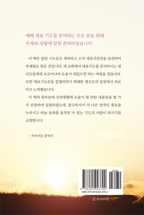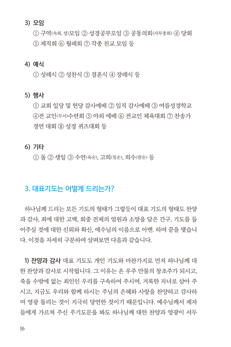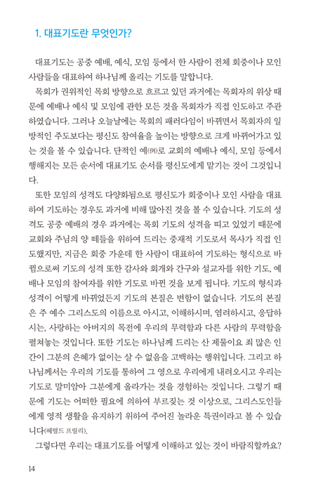 ÀÌ Ã¥Àº ´ëÇ¥±âµµ¹®¸¸À» ¾ö¼±ÇÏ¿© ÁÖÁ¦º°·Î ¿«Àº °ÍÀÔ´Ï´Ù. ´ëÇ¥±âµµ¶õ °øÁß ¿¹¹è, ¿¹½Ä, ¸ðÀÓ µî¿¡¼ ÇÑ »ç¶÷ÀÌ Àüü ȸÁßÀ̳ª ¸ðÀÎ »ç¶÷µéÀ» ´ëÇ¥ÇÏ¿© Çϳª´Ô²² ¿Ã¸®´Â ±âµµ¸¦ ¸»ÇÕ´Ï´Ù. °ú°Å¿¡´Â ¸ñȸÀÚ°¡ Á÷Á¢ ÀεµÇϰí ÁÖ°üÇÏ¿´Áö¸¸ ¿À´Ã³¯¿¡´Â ¸ñȸÀÇ ÆÐ·¯´ÙÀÓÀÌ ¹Ù²î¸é¼ Æò½ÅµµÂü¿©À²À» ³ôÀÌ´Â ¹æÇâÀ¸·Î ³ª¾Æ°¡°í Àִµ¥ ´ëÇ¥±âµµ ¼ø¼¸¦ Æò½Åµµ¿¡°Ô ¸Ã±â´Â °ÍÀÌ ±×°ÍÀÔ´Ï´Ù. ´ëÇ¥±âµµ´Â ȸÁß Àüü¸¦ ´ëÇ¥ÇÏ¿©±âµµÇÏ°í °øµ¿Ã¼ ÀüüÀÇ ÀÔÀåÀ» ´ëº¯ÇÏ´Â ¸¶À½À¸·Î ±âµµÇØ¾ß ÇÕ´Ï´Ù. ÀÌ Ã¥ÀÌ ´ëÇ¥±âµµ¸¦ Çϴµ¥ ¸¹Àº µµ¿ò°ú ÁöħÀÌ µÇ±æ ¹Ù¶ø´Ï´Ù.