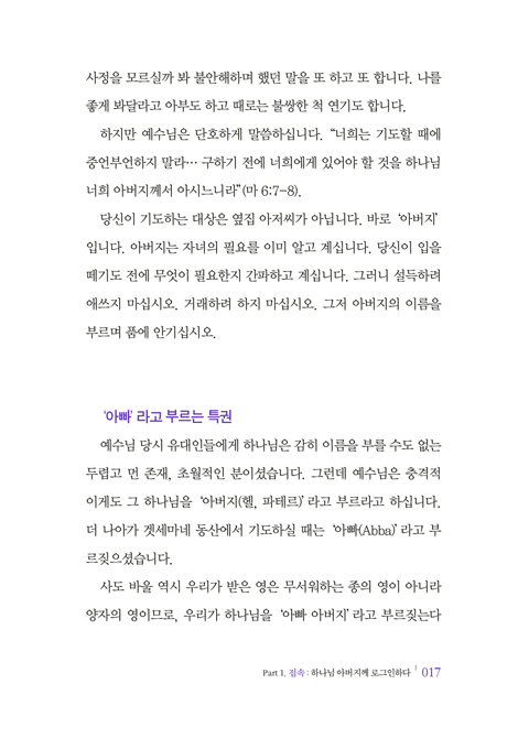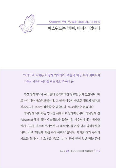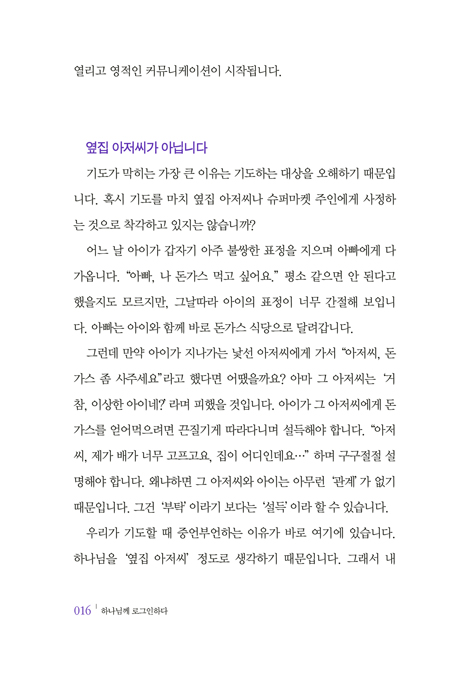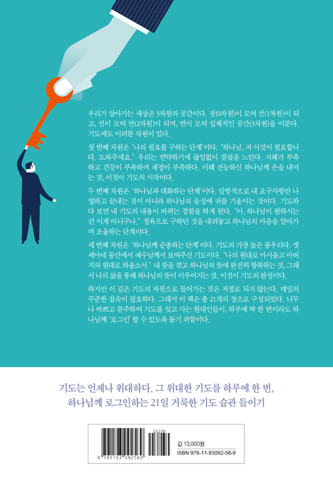ÇÏÁö¸¸ ÀÌ ±íÀº ±âµµÀÇ Â÷¿øÀ¸·Î µé¾î°¡´Â °ÍÀº ÀúÀý·Î µÇÁö ¾Ê´Â´Ù. ¸ÅÀÏÀÇ ²ÙÁØÇÑ Á¢¼ÓÀÌ ÇÊ¿äÇÏ´Ù. ±×·¡¼ ÀÌ Ã¥Àº ÃÑ 21°³ÀÇ ÀåÀ¸·Î ±¸¼ºÇß´Ù. ³Ê¹«³ª ¹Ù»Ú°í ºÐÁÖÇÏ¿© ±âµµ¸¦ ÀØ°í »ç´Â Çö´ëÀεéÀÌ ÇÏ·ç¿¡ µü ÇÑ ¹øÀÌ¶óµµ Çϳª´Ô²² ¡®·Î±×ÀΡ¯ÇÒ ¼ö ÀÖµµ·Ï µ½±â À§ÇÔÀÌ´Ù. ÀÌ Ã¥Àº ´©±¸³ª ½±°Ô ÀÐÀ» ¼ö ÀÖµµ·Ï ¾²¿´Áö¸¸, ±× ³»¿ëÀº °áÄÚ °¡º±Áö ¾Ê´Ù. ¼º°æ ¸»¾¸À» Åä´ë·Î ±âµµÀÇ °¡Àå ±íÀº ½É¿¬±îÁö µé¾î°¥ ¼ö ÀÖµµ·Ï ¾È³»ÇÑ´Ù. 21¹øÀÇ ¹Ýº¹µÈ ·Î±×ÀÎ ÈÆ·ÃÀ» ÅëÇØ ´ç½ÅÀÇ »îÀÌ ±âµµÀÇ ÀÚ¸®·Î ³ª¾Æ°¥ ¼ö ÀÖµµ·Ï µ½´Â´Ù.