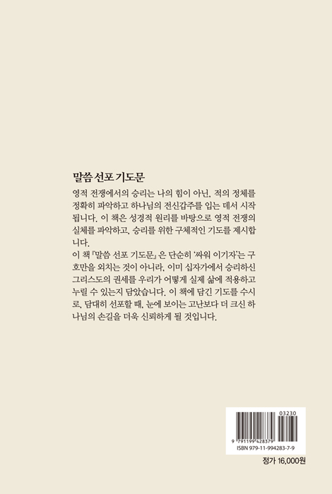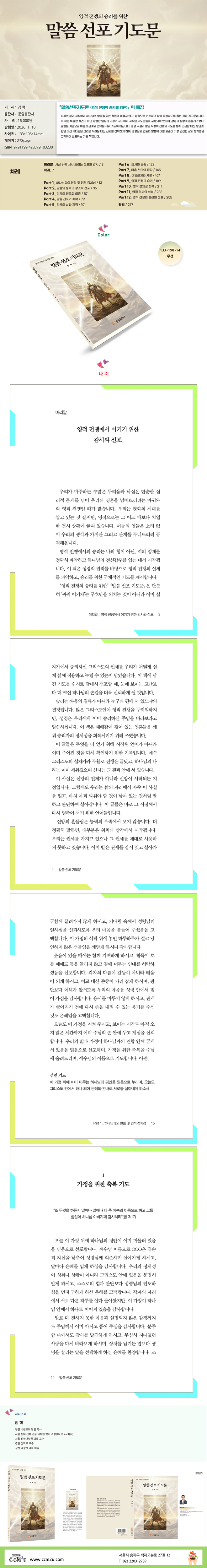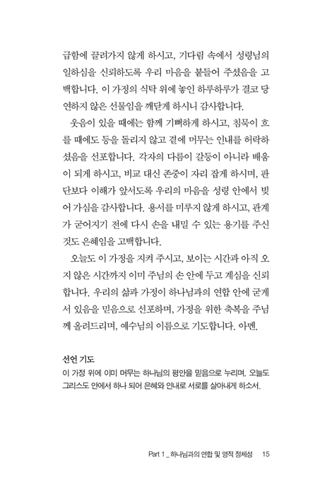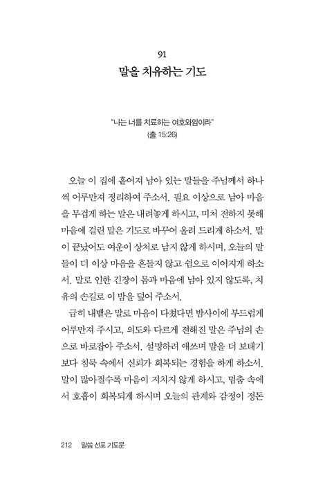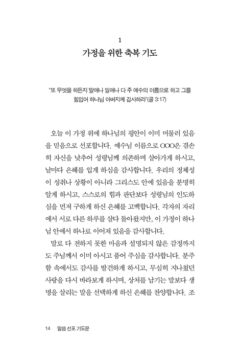 ÇÏ·çÀÇ ³¡°ú ½ÃÀÛ¿¡¼ Çϳª´ÔÀÇ ¸»¾¸À» Àд Â÷¿ø¿¡ ¸Ó¹°Áö ¾Ê°í, ¹ÏÀ½À¸·Î ¼±Æ÷ÇÏ¸ç »î¿¡ Àû¿ëÇϵµ·Ï µ½´Â °¡Á¤ ±âµµ¹®ÀÔ´Ï´Ù. ÀÌ Ã¥Àº Ưº°ÇÑ »ç°ÇÀÌ ¾Æ´Ñ Æò¹üÇÑ ÀÏ»ó°ú °¡Á¤ÀÇ ÀÚ¸®¿¡¼ ½ÃÀÛµÈ ±âµµ¹®µé·Î ±¸¼ºµÇ¾î ÀÖÀ¸¸ç, °¨Á¤°ú »óȲ¿¡ Èçµé¸®±âº¸´Ù ¸»¾¸À» ±âÁØÀ¸·Î ¸¶À½°ú °ü°è¿Í ¼±ÅÃÀ» ¼¼¿ö °¡µµ·Ï À̲ü´Ï´Ù. ¼º°æ ±¸Àý°ú ªÀº ¹¬»óÀÌ ¼±Æ÷ÀÇ ±âµµ¸¦ ÅëÇØ Á¶±ÞÇÔ ´ë½Å Æò¾È°ú ÆÇ´Ü ´ë½Å ±â´Ù¸²À» ±×¸®°í µÎ·Á¿ò ´ë½Å ½Å·Ú¸¦ ¼±ÅÃÇÏ°Ô Çϸç, ¼º·É´ÔÀÇ Àεµ¿Í ¸»¾¸¿¡ ´ëÇÑ ÀÇÁ¸ÀÌ °¡Àå ¾ÈÀüÇÑ »îÀÇ ¹æ½ÄÀÓÀ» °í¹éÇÏ¸ç ¼±Æ÷ÇÏ´Â ±âµµ Ã¥ÀÔ´Ï´Ù. ÀúÀÚ ¹× ¿ªÀÚ ¼Ò°³